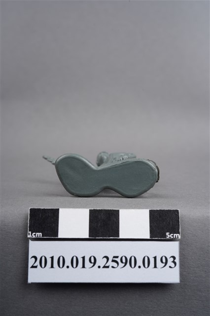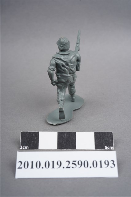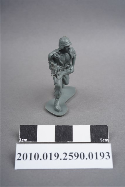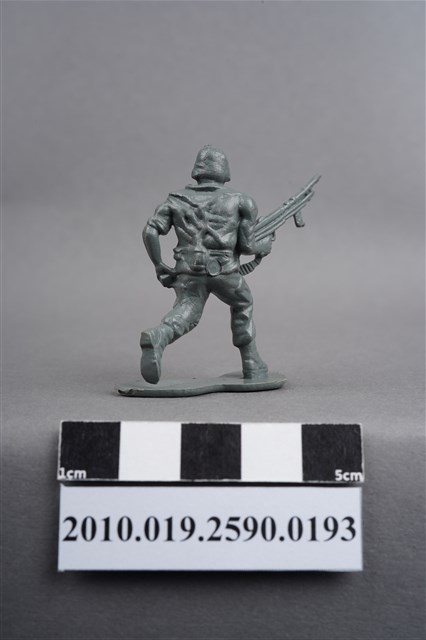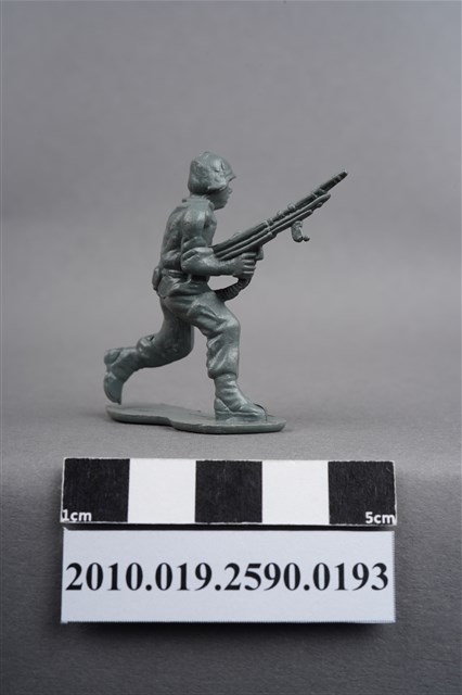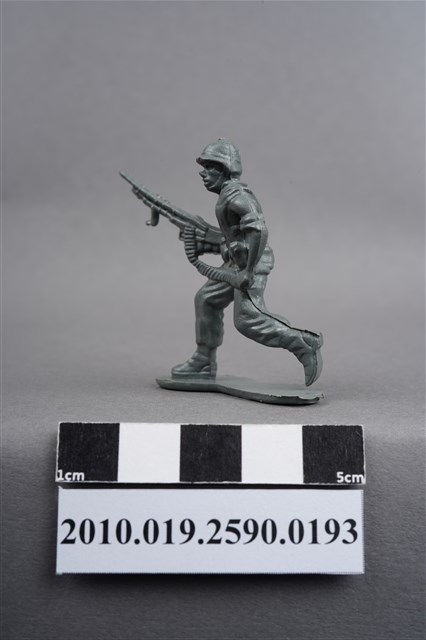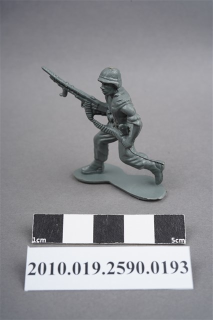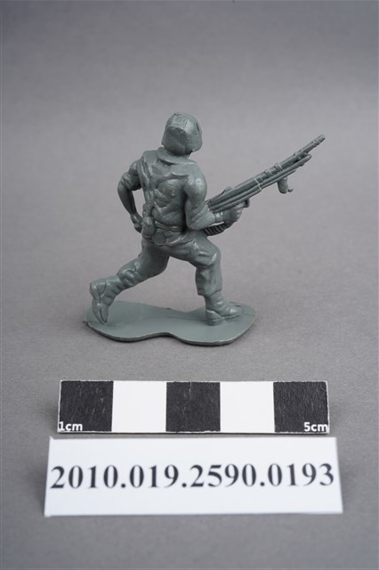 1.本物件為灰色機槍兵造型玩具士兵,高約4公分,寬約為5公分,為塑膠材質。外型為機槍兵,士兵頭戴鋼盔,身著軍服,裸露胸口,腳著軍靴,右手持機槍,左手拿著由機槍機身延伸而出的彈鍊,呈奔跑姿。右下腰處有一圓形痕。物件整體底部連接著稱為「pod feet」的底板,底板邊緣有些微磨損,底部略呈凹陷,大致平整。物件兩側可見射出接縫線。本系列玩具士兵多為相同塑膠模版,僅有顏色不同,或是同色同塑膠模版等形式。2.1938年美國玩具公司Bergen Toy and Novelty Co.開始銷售廉價的塑膠微型單色士兵系列,高約2英寸,各有不同的作戰姿勢及工具武器,美軍部分參照美軍部隊使用了軍綠色,之後推出灰色的德軍部隊及黃色的日軍部隊。1950年代因塑膠製造業的蓬勃發展,以及鉛中毒的恐慌,使得塑膠製且價格低廉的玩具士兵取代昂貴的彩繪金屬士兵,並定型為目前廣為人知的二戰系列。除了士兵系列外,市面上亦能見到牛仔與印地安人、太空人、騎士、恐龍、消防員、警察等各種角色。