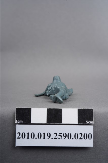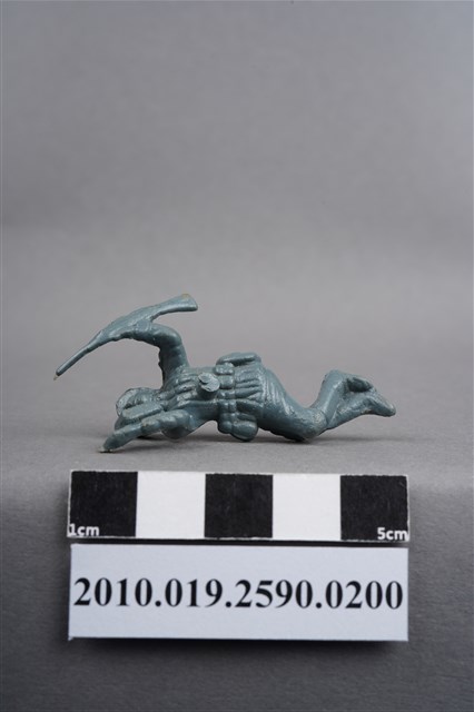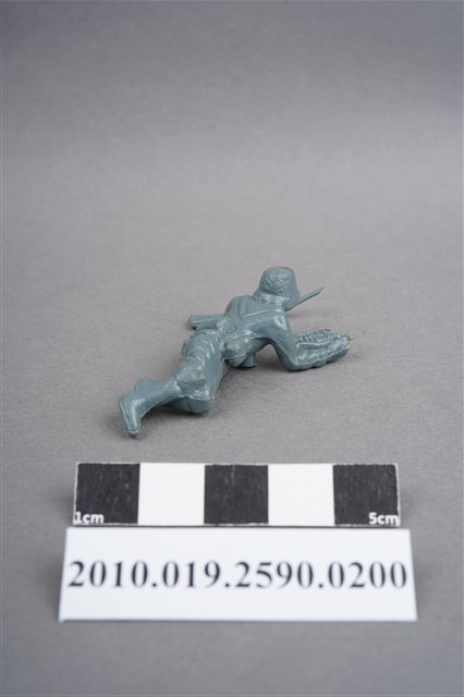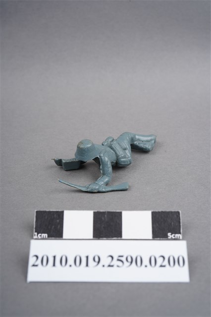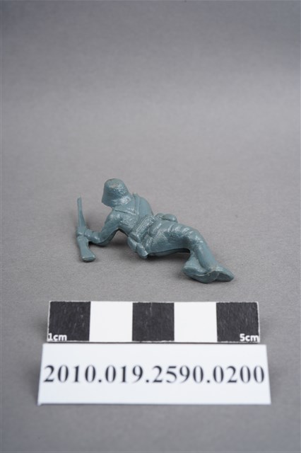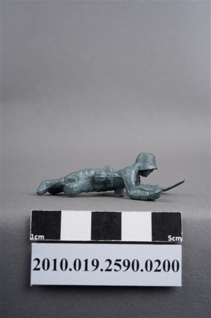 1.本物件為藍綠色步兵造型玩具士兵,高約1.5公分,長約為5.5公分,為塑膠材質。外型為步兵,士兵頭戴鋼盔,身著軍服,腰帶上有水壺、腰袋等物品,腳著軍靴,呈匍匐姿,左手持步槍,步槍扭曲變形,右手持不明物體,雙腳屈膝交疊。腹部有一圓柱形突出。物件兩側可見射出接縫線,整體細節粗糙,有多處髒污磨損。本系列玩具士兵多為相同塑膠模版,僅有顏色不同,或是同色同塑膠模版等形式。