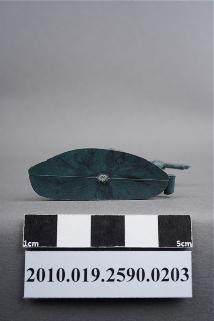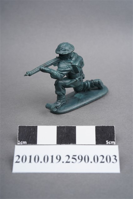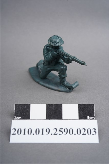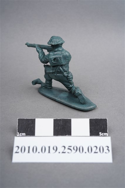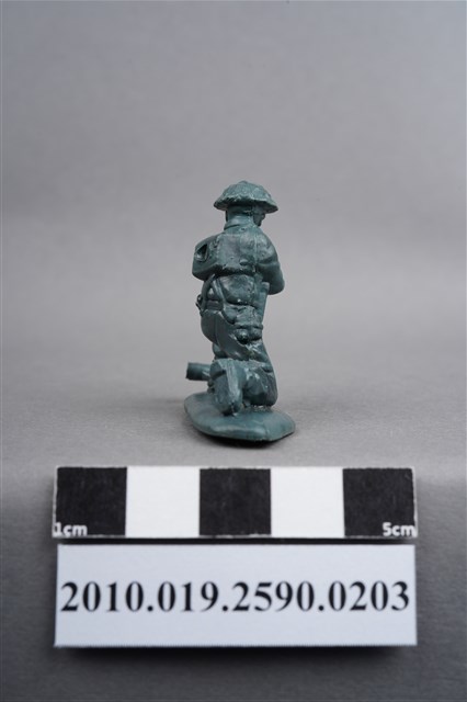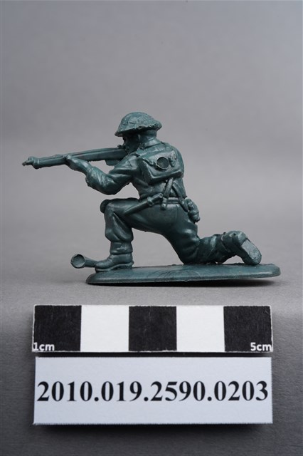 1.本物件為藍綠色步兵造型玩具士兵,高約3公分,寬約為5.5公分,為塑膠材質。外型為步兵,士兵頭戴鋼盔,身著軍服,腰帶上有彈袋、水壺、刺刀及背袋,腳著軍靴,呈單膝跪姿,雙手持步槍瞄準前方。背包有一圓形痕,呈凹陷狀,右腳腳底有圓形痕,左腳尖端有大塊圓柱狀殘膠。物件整體底部連接著稱為「pod feet」的底板,底板因色澤不均呈大理石紋,底部中央有射出痕及接縫線。物件兩側可見射出接縫線。本系列玩具士兵多為相同塑膠模版,僅有顏色不同,或是同色同塑膠模版等形式。
