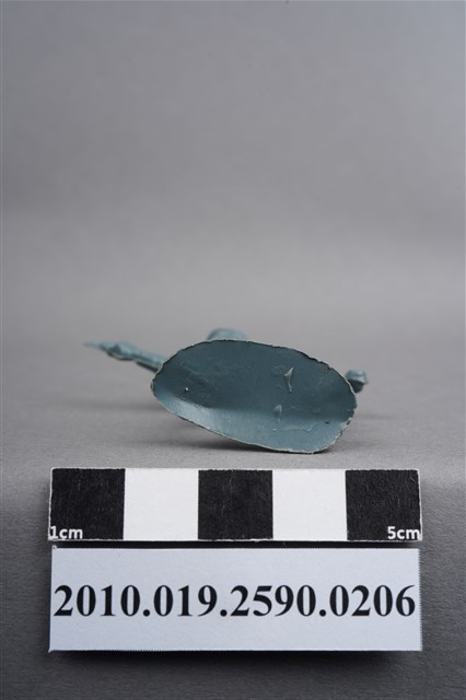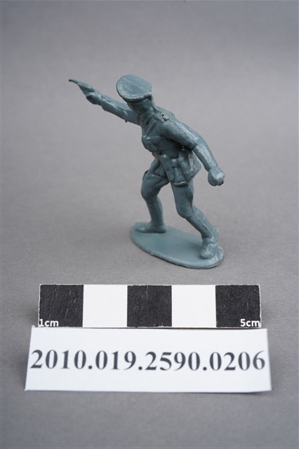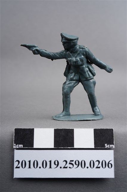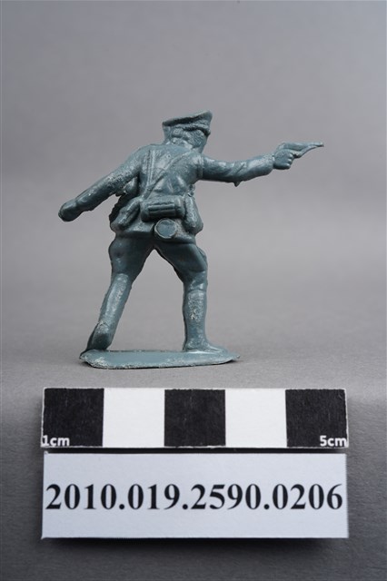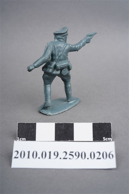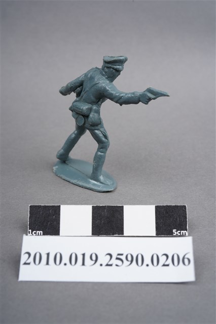 1.本物件為藍綠色步兵造型玩具士兵,高約4.5公分,寬約為5公分,為塑膠材質。外型為步兵,士兵頭戴軍帽,身著軍服,腰帶上有彈袋、水壺、腰袋及手槍槍袋,腳著軍靴,右手持手槍瞄準前方,左手握拳,右腳往前跨一步。右臀有一凸出之射出痕,邊緣有殘膠。物件整體底部連接著稱為「pod feet」的底板,底板邊緣有殘膠,底部有數處凹陷及突起物。物件兩側可見射出接縫線,整體明顯可見使用痕跡。本系列玩具士兵多為相同塑膠模版,僅有顏色不同,或是同色同塑膠模版等形式。