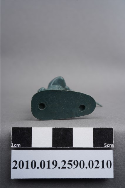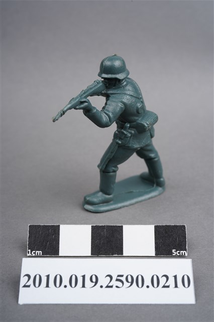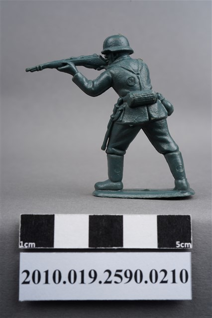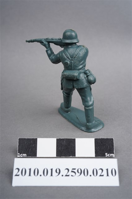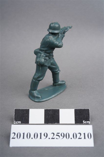 1.本物件為藍綠色步兵造型玩具士兵,高約3.5公分,寬約為5公分,為塑膠材質。外型為步兵,士兵頭戴鋼盔,身著軍服,腰帶上有水壺、腰袋、刺刀及工兵鏟等物品,腳著軍靴,雙手平舉步槍瞄準前方。右肩處有射出痕,左背處有一圓柱狀突起,兩小腿後側各有一圓形痕。物件整體底部連接著稱為「pod feet」的底板,底板邊緣有些微磨損,底部不甚平整,有許多粒狀物,兩端各有一圓洞。物件兩側可見射出接縫線。本系列玩具士兵多為相同塑膠模版,僅有顏色不同,或是同色同塑膠模版等形式。