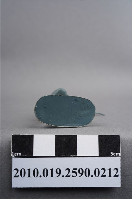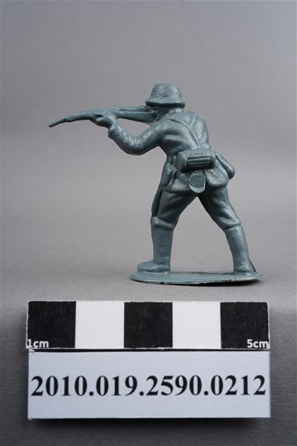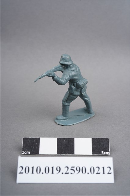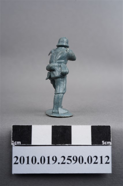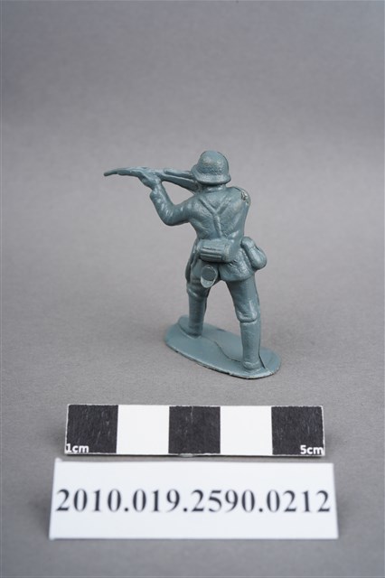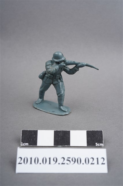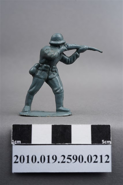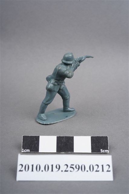1.本物件為藍綠色步兵造型玩具士兵,高約3公分,寬約為4公分,為塑膠材質。外型為步兵,士兵頭戴鋼盔,身著軍服,腰帶上有水壺、腰袋及工兵鏟,腳著軍靴,雙手持步槍瞄準前方。右肩有射出痕,邊緣略顯破裂。左臀外側有一圓柱狀突起,邊緣有殘膠。物件整體底部連接著稱為「pod feet」的底板,底板邊緣有磨損及殘膠,底部有突起之粒狀物及污漬。物件兩側可見射出接縫線。本系列玩具士兵多為相同塑膠模版,僅有顏色不同,或是同色同塑膠模版等形式。