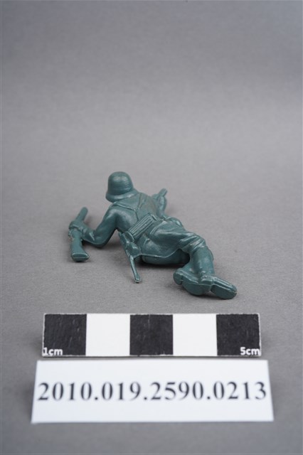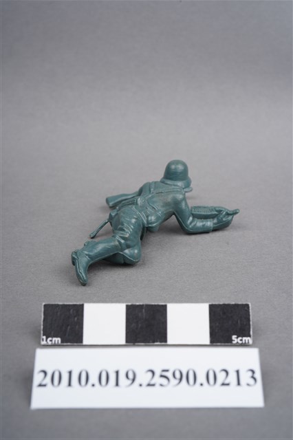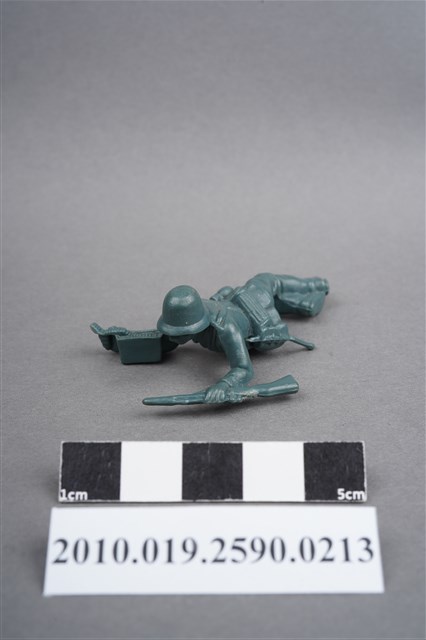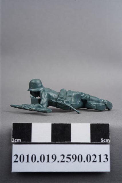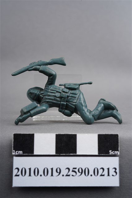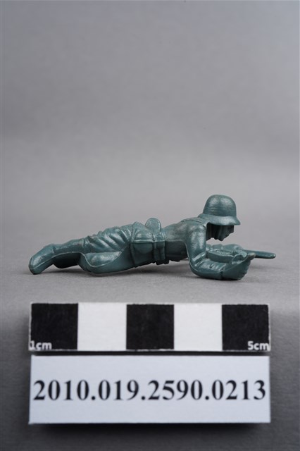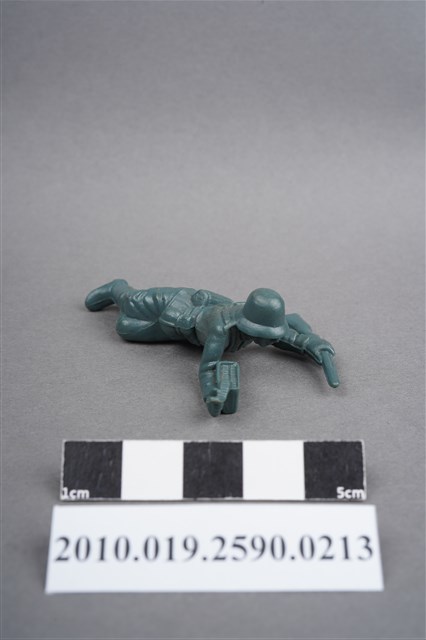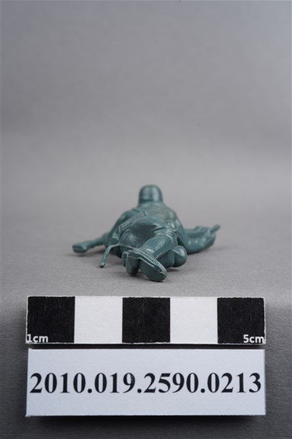 1.本物件為藍綠色步兵造型玩具士兵,高約1.5公分,長約為5.5公分,為塑膠材質。外型為步兵,士兵頭戴鋼盔,身著軍服,腰帶上有水壺、腰袋、工兵鏟等物品,腳著軍靴,雙腳屈膝交疊,呈匍匐姿。左手持步槍,右手持無線電。腹部及左小腿外側各有一圓形痕,上衣下襬有一疑似「9」之文字。物件兩側可見射出接縫線。本系列玩具士兵多為相同塑膠模版,僅有顏色不同,或是同色同塑膠模版等形式。