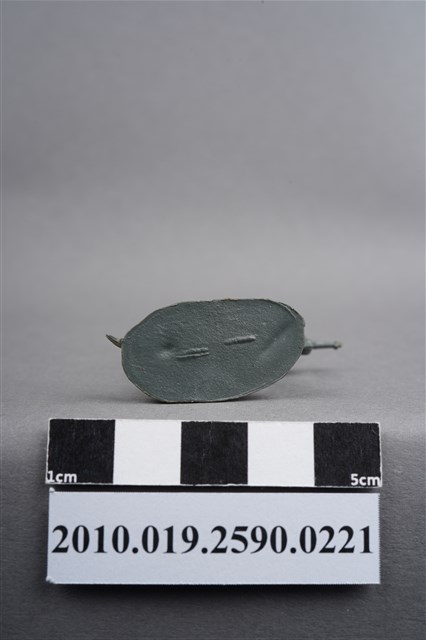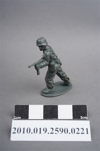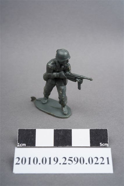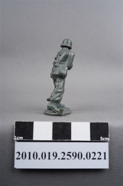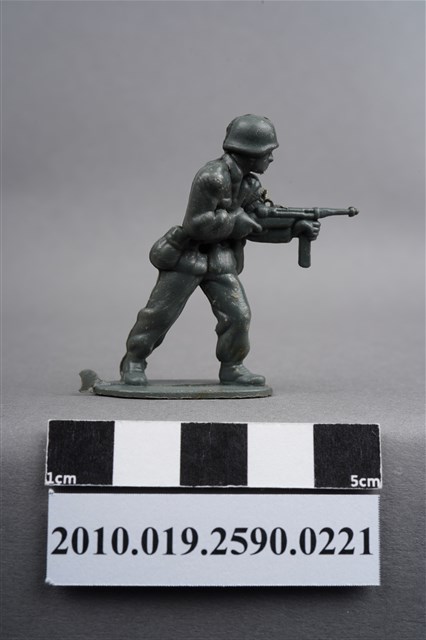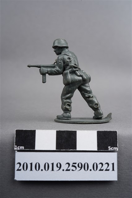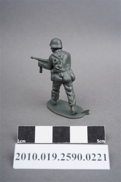 1.本物件為灰色機槍兵造型玩具士兵,高約5公分,寬約為3公分,為塑膠材質。外型為機槍兵,士兵頭戴鋼盔,身著軍服,腰帶上有彈袋、腰袋及水壺,腳著軍靴,雙手持衝鋒槍呈行走狀。左背部及兩小腿後側各有一圓形痕,略呈凹陷,並有殘膠。物件整體底部連接著稱為「pod feet」的底板,底板邊緣有磨損及殘膠,底部則有凹陷及突起痕。物件兩側可見射出接縫線。本系列玩具士兵多為相同塑膠模版,僅有顏色不同,或是同色同塑膠模版等形式。