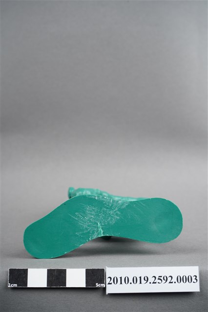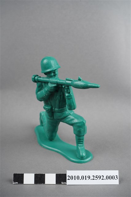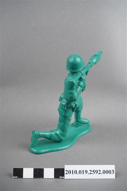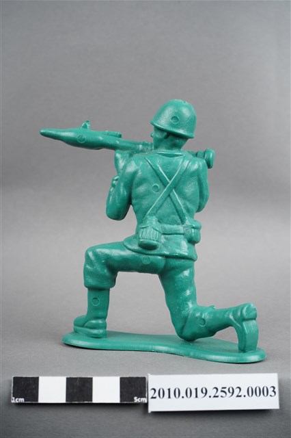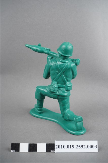 1.本物件為綠色步兵造型玩具士兵,高約8公分,寬約為9公分,為塑膠材質。外型為步兵,士兵頭戴鋼盔,身著軍服,腰帶上有彈袋、手槍及水壺等物品。雙手持肩扛型火箭筒貼於右肩,單膝跪地呈瞄準姿。鋼盔後方、左背部、左臀部、左小腿外側、右小腿內側及火箭彈彈身各有一圓形痕。物件整體底部連接著稱為「pod feet」的底板,底板底部有明顯刮痕及突起物。物件兩側可見射出接縫線,另本物件尺寸較一般玩具士兵大,細部結構亦較一般玩具士兵細緻。本系列玩具士兵多為相同塑膠模版,僅有顏色不同,或是同色同塑膠模版等形式。