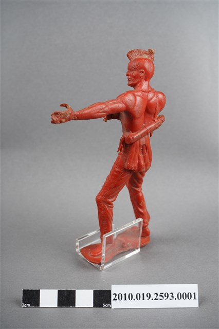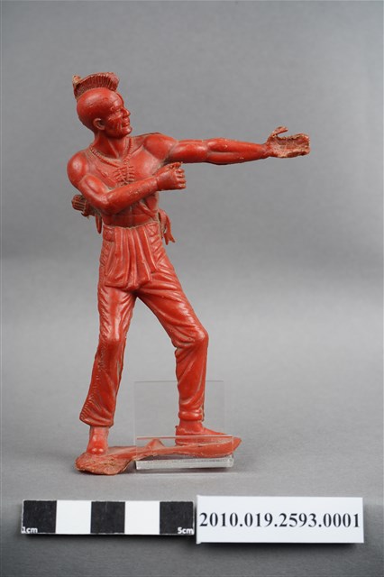 1.本物件為紅色印地安人造型玩具士兵,高約12公分,寬約為6公分,為塑膠材質。外型為印地安人,頭髮剃光僅留頭頂一道頭髮,上身裸露,頸部掛有項鍊,斜背弓袋,長褲兩外側縫有飾條,下腹處垂飾布腰帶末端,著短靴。雙手做拉弓姿,左手手掌毀損。臀部有一圓形凹洞,中有一深孔,邊緣有年輪痕。物件整體底部連接著稱為「pod feet」的底板,底板底部有接縫痕及明顯磨損痕跡。物件兩側可見射出接縫線,整體多處可見磨損污痕,另本物件尺寸較一般玩具士兵大,細部結構亦較一般玩具士兵細緻。本系列玩具士兵多為相同塑膠模版,僅有顏色不同,或是同色同塑膠模版等形式。