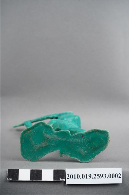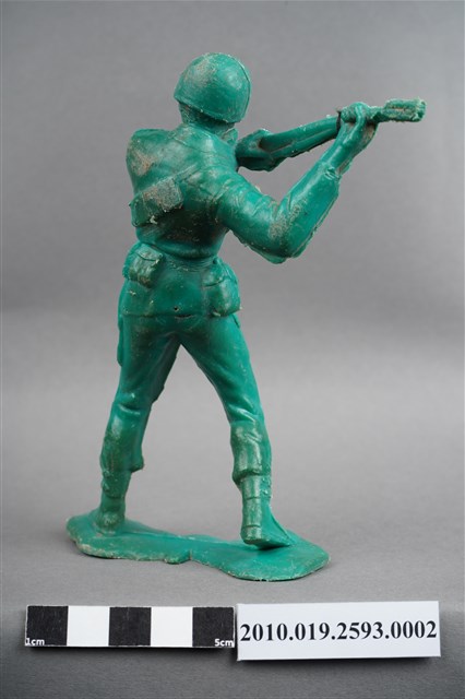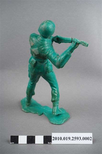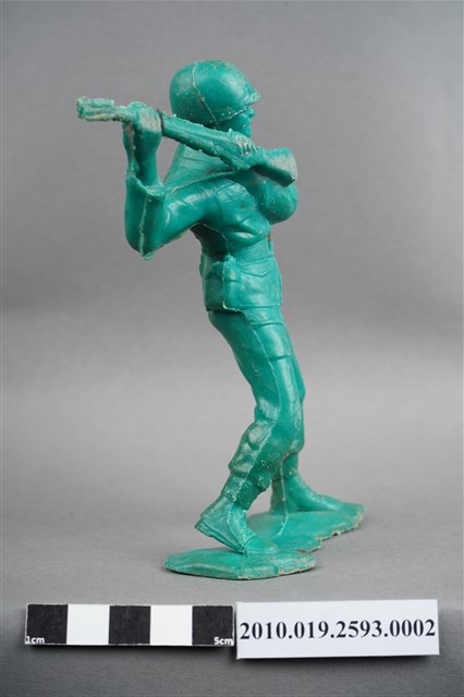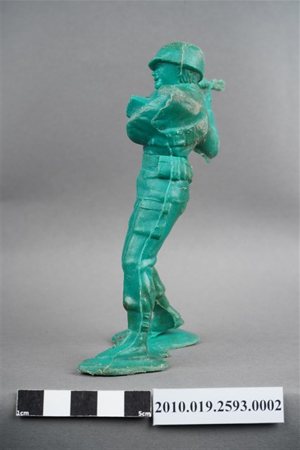 1.本物件為藍綠色步兵造型玩具士兵,高約12公分,寬約為7公分,為塑膠材質。外型為步兵,士兵頭戴鋼盔,身著軍服,S型腰帶上有彈袋、腰袋及水壺等物品,腰帶扣環處有紅色污痕。背後有一條備用彈袋。雙手往右後方高舉步槍,似欲以槍托擊打某物。臀部有一小孔。物件整體底部連接著稱為「pod feet」的底板,底板底部有明顯磨損痕跡。物件兩側可見射出接縫線,整體可見大量使用造成的磨損情況。另本物件尺寸較一般玩具士兵大,細部結構亦較一般玩具士兵細緻。本系列玩具士兵多為相同塑膠模版,僅有顏色不同,或是同色同塑膠模版等形式。