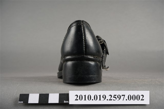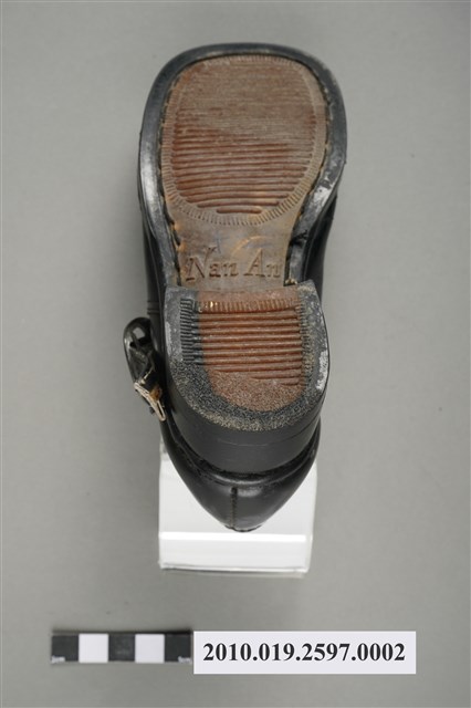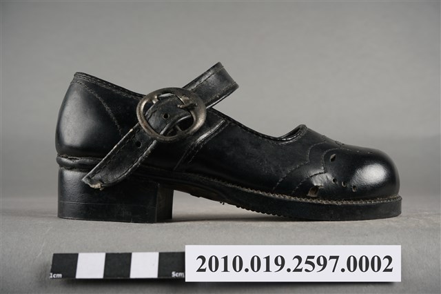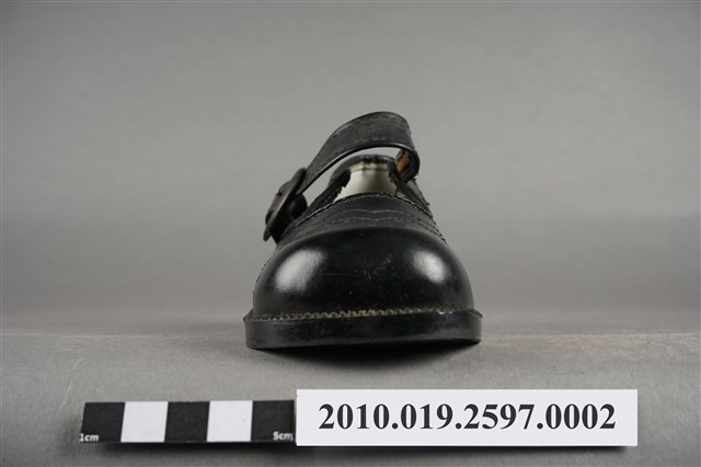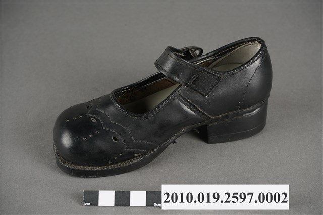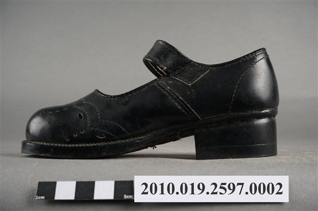 1.本件為牛屋牌兒童皮鞋的右足,為傳統瑪麗珍鞋款式,黑色皮革材質,包腳圓楦頭,在腳背有一條綁帶,穿著時以環扣固定。鞋面上有波浪壓紋及皮革鏤空增加美感,鞋外底為生膠底,中間有「Nan An」凸體字樣,鞋內底部印有「牛屋」、「高級皮鞋」金色字樣。2.腳背有綁帶的童鞋出現於19世紀初期,最初屬於男孩女孩均可穿著的鞋款。如今,瑪麗珍鞋被認為是正式或半正式的女童鞋款,適合在正式場合穿著。