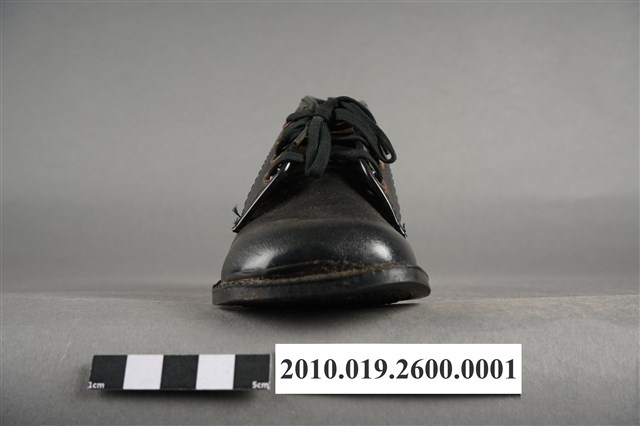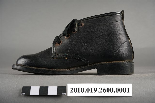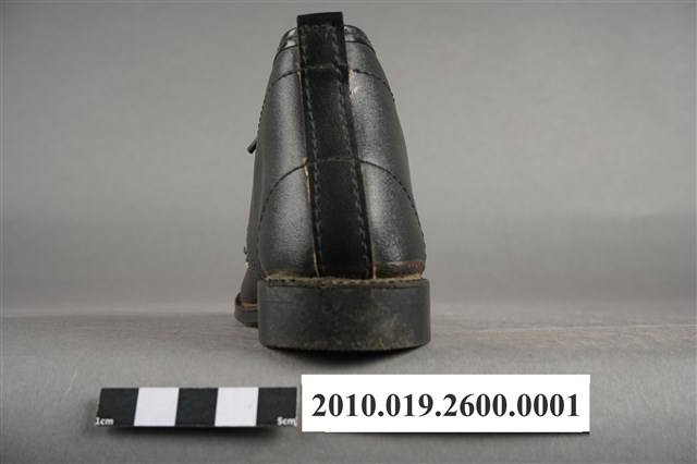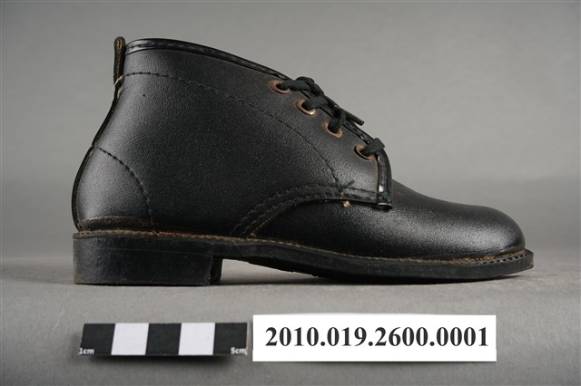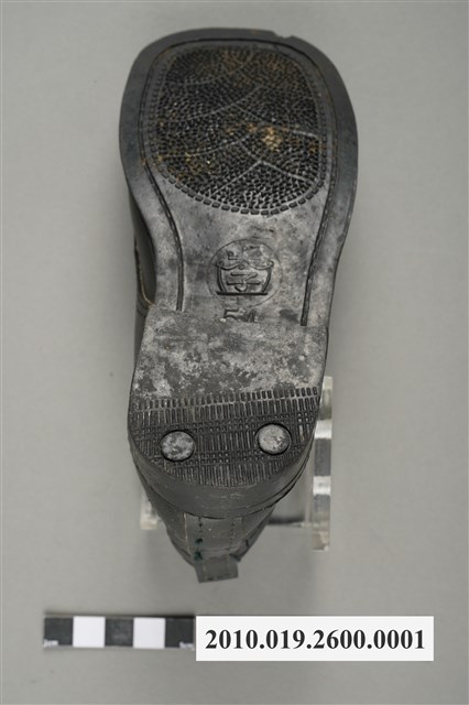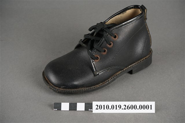 1.本件為太子牌童靴之左足,黑色皮革材質,圓楦頭,鞋筒高度及踝,繫鞋帶設計。鞋外底為黑色膠底,中間刻有「太子」浮雕圖樣及「54」字樣,鞋內底部印有「金魚牌」、「Fish」藍色字樣及一隻金魚圖樣。2.1960年代後,因經濟環境改善,民眾對鞋履需求成長,政府將製鞋業列為重要外銷加工業,製鞋業蓬勃發展,有「製鞋王國」美名,然而當時除了「生生皮鞋」「寶島皮鞋」等少數本土品牌外,臺灣零售市場大多為白牌(no brand)鞋品,銷售通路主要集中在傳統市集、攤販及街邊店等人潮聚集處。
