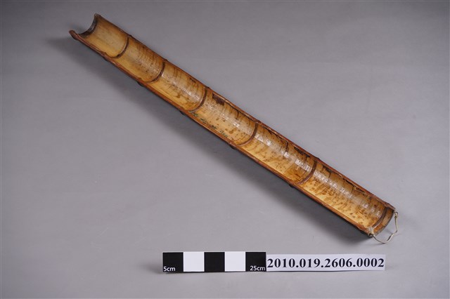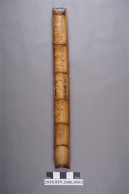 1.此為竹楹聯對組之下聯,長12公分,寬117.5公分,高6公分,係以單根粗壯竹身剖半後,分別作2件楹聯,正面保留原本竹皮,採陰刻方式製作,內容為「里有仁人燦帝邦」,底部題記「子淵書」,旁有印二枚。字內填上黑色塗料,背面保留原始竹子之淺黃褐色。2.竹楹聯又稱對聯,或稱此君聯,因竹子有節,自古便象徵君子氣節。楹聯多以竹、木或石材雕鑿,主要裝飾於廳堂之柱面。竹製楹聯則多裝飾於園林亭閣,或常見於書齋等處。其字句多表格言或心境,需字數相同,平仄協調,對仗工整。