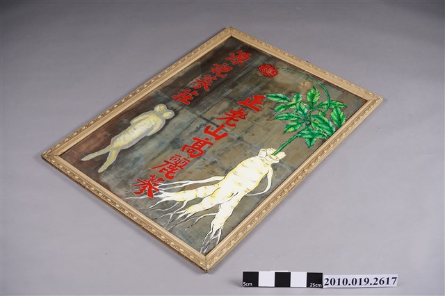 1.本件源記蔘莊正老山高麗蔘鏡係以木質畫框與玻璃鏡組合而成,為直立長方形,米白色歐式浮雕畫框,玻璃鏡面中央有「正老山高麗蔘」紅色大字,右邊有一株帶有綠葉並開紅花的人蔘,左邊則有「源記蔘莊」字樣及小支人蔘圖。鏡子背面有襯板固定玻璃鏡,邊框上方有1個金屬製掛勾,可將鏡子壁掛於牆上。2.人蔘為名貴中藥材,有「百草之王」之美譽。朝鮮半島出產的高麗蔘,其藥效活性成分又冠於其他蔘種,其中高齡的野生山蔘通常被認為藥效及滋補效果最佳,稀有且價格昂貴。早期臺灣假蔘氾濫,店家都會強調「正老山」,以表示貨真價實。3.1950~1960年代,玻璃鏡畫屬於相當時髦的室內裝飾品,常用來祝賀新屋落成、商號開張、賀壽,在鏡面印上公司及產品名稱及圖樣,掛在商家店內,除了裝飾店面外,亦可達廣告宣傳效果。4.源記蔘莊,一家曾位於臺南市中西區的中藥行,1951年開業,2012年歇業。