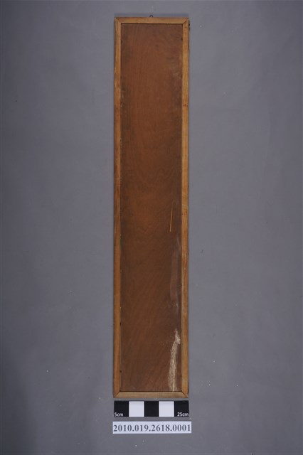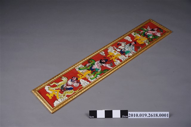 1.本件八仙玻璃畫「福祿壽金」聯為八仙玻璃畫對聯之右聯,呈長直幅,裱金漆花邊木框,上方中央釘有一個掛勾,可掛於牆上做為裝飾。以紅色為底,繪有鍾離權、呂洞賓、曹國舅、韓湘子等八仙中的四位仙人,並提有黃字白框之「福祿壽金」四字,右上方以金漆寫有「祝新居誌喜」,與左聯中的署名對照可知本件為致贈手足新居落成之賀禮。