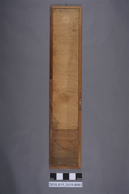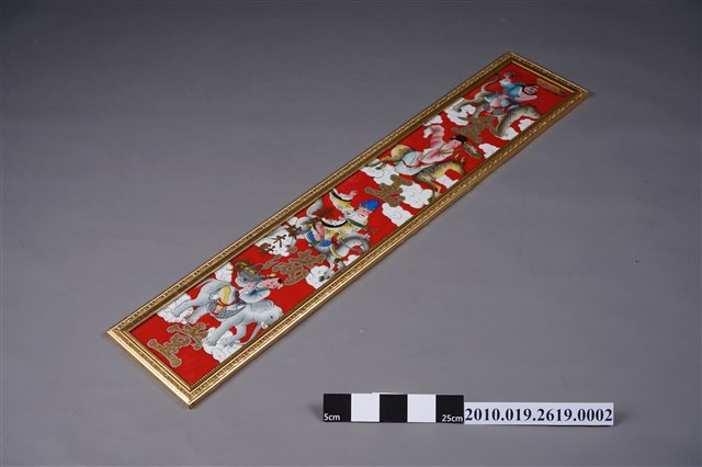1.本件八仙玻璃畫「金玉滿堂」聯為八仙玻璃畫對聯之左聯,呈長直幅,裱金漆花邊木框,上方中央釘有一個掛勾,可掛於牆上做為裝飾。以紅色為底,繪有鐵拐李、何仙姑、張果老、藍采和等八仙中的四位仙人,並提有金蔥白框之「金玉滿堂」四字,左下方以金漆寫上「岳父林木財賀」,對照右聯中的賀辭可知本件為致贈女婿新居落成之賀禮。