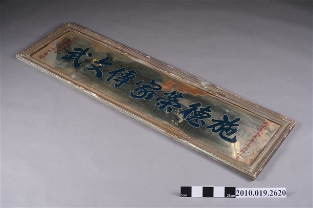 1.本件「施德榮家傳文武」贈匾呈橫長條型,為臺南市縫紉工會理監事同仁贈予施徳榮理事長華廈落成的匾額,裱褐色花邊木框,上方釘有二個圈環,可掛於門楣或廳堂做為裝飾。以一層銀色鏡面漆為底,上下有多處掉漆痕跡,中央題有「施徳榮家傳文武」七個黑色大字,並以白色描邊,右方寫有「施理事長武華廈鼎新誌慶」,左方寫有「台南市縫紉工會理監事同仁敬賀」等紅字。