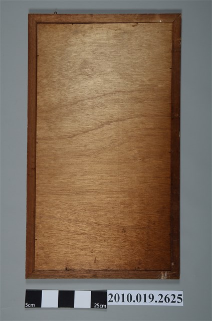 1.本件八仙祝壽玻璃畫為長方形直幅,裱銅色漆花邊木框成為畫幅,木框上方右邊有一圈環,推測左邊原本應該也有圈環,可掛於牆上做為裝飾。畫面以紅色為底,以黑色勾勒出「壽」字輪廓,壽字內填金色,並繪有張果老、鍾離權、韓湘子、呂洞賓、鐵拐李、曹國舅、何仙姑、藍采和等八位仙人,象徵八仙祝壽的吉祥喻意。2.玻璃畫又稱為玻璃彩繪,屬於民間的平面藝術,使用毛筆沾油漆在平板玻璃背面作畫。臺灣的玻璃彩繪約始於日治時期,光復後受到工業化量產的影響開始流行於一般階層,約於民國40、50年代達到鼎盛時期。玻璃畫的題材多帶有吉祥意味,常用來作為祝壽、婚慶、新居落成、商店開張等誌喜之賀禮。