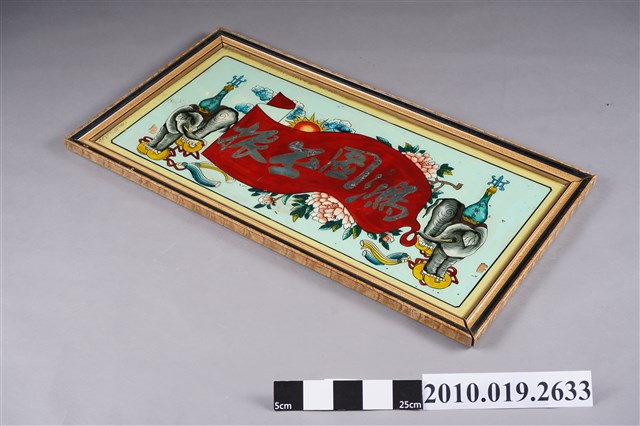 1.本件「鴻圖丕振」玻璃畫為長橫幅,裱黑條紋褐色木框成為匾額,上方釘有二個掛勾,可掛於門楣或廳堂做為裝飾。以淺藍色為底,畫面四周以淡黃色、黑細線作一邊框,框內以淺藍色為底,中央紅色布條上寫有「鴻圖丕振」四個大字,布條左右二側各繪有一隻腳踩銅錢頭頂花瓶的大象,瓶上寫著「太平景象」四字,布條上下繪有彩雲、太陽、牡丹等圖案。