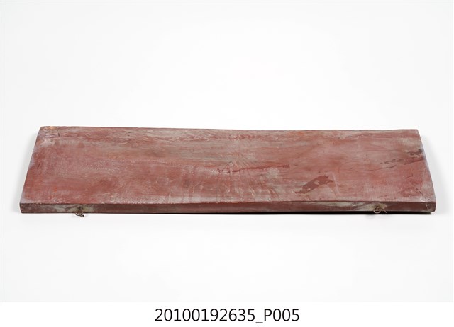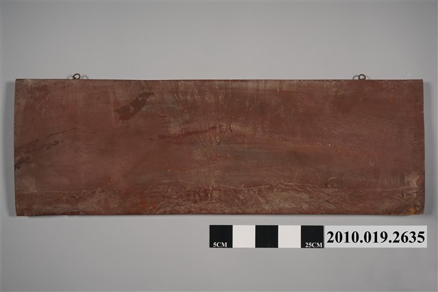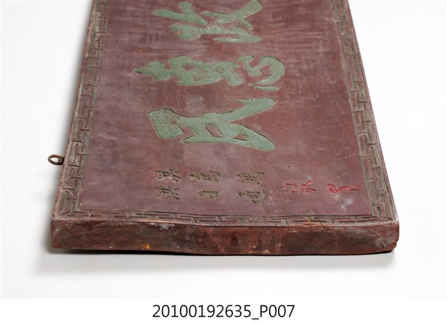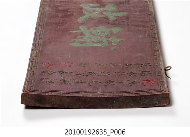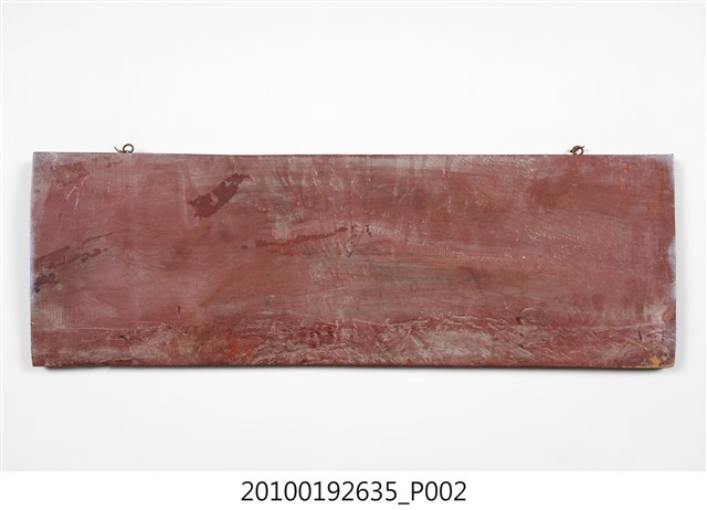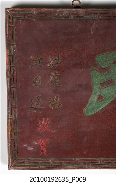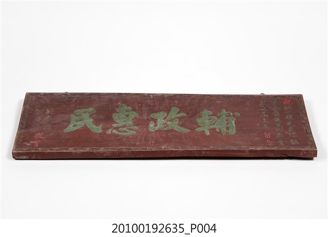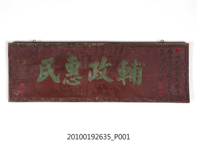 1.本件為民國58年洪慈鴻洪日通賀沈丁焜連任鹽水鎮代表會主席「輔政惠民」木匾,上款陰刻「祝沈丁焜先生蟬联塩水鎮民代表會第九屆主席留念」,中間為陽刻綠漆橫書匾文「輔政惠民」四大字,下款陰刻「洪慈鴻 洪日通敬賀」。匾額整體以一塊木板製成,正面施紅漆,四邊裝飾陰刻之連續工字紋,背面不上漆,露出原木色,頂端有兩個金屬環,用以懸掛之用。