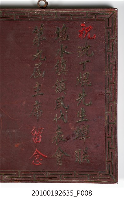 2.此匾致賀對象沈丁焜先生,為鹽水鎮竹埔里人,原為國民學校教員、鹽水原料區委員,於民國39年(1950)參選鹽水鎮第三屆鎮民代表當選,後又多次當選連任,活躍於當地政壇,曾擔任鹽水鎮農會理監事、鹽水鎮農會理事長、代表會副主席、代表會主席等地方重要職務,是戰後初期鹽水鎮重要的政治人物之一。此匾額即是民國58年(1969)沈丁焜先生連任鎮民代表會主席時,所獲贈之賀匾,見證臺灣地方自治與政治活動的歷史。