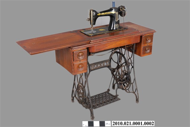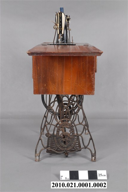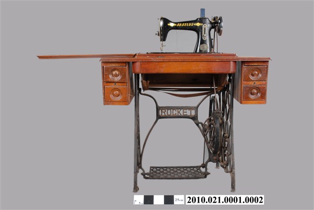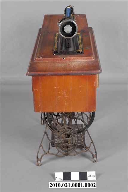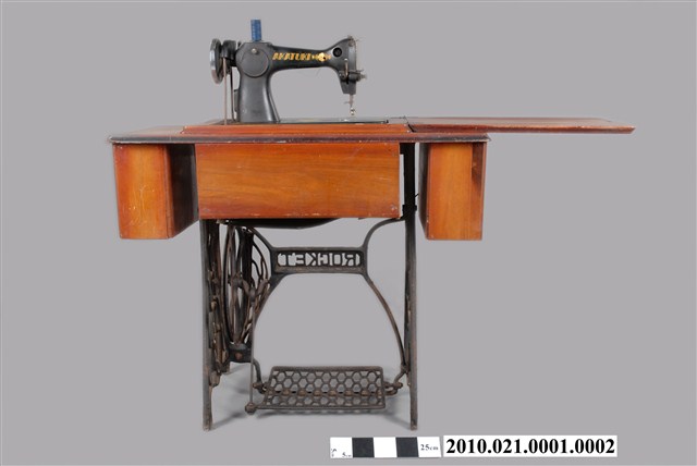 本文物為曉(原文:AKATUKI)牌腳踏式裁縫機,金屬機體,附木質工作桌板及收納抽屜、金屬支腳及踏板。本體結構、木製收納抽屜與裝載機體皆狀況良好。1790年英國人湯瑪斯‧聖特(Thomas Saint)為提高製鞋效率設計手搖裁縫機,在多次的改良之下,時至1853年多數家庭使用之腳踏裁縫機才出現。而傳統家庭中的縫紉工作多由女性擔任,因此縫紉機出現反映女性生活與科技互動,所產生工作型態之改變。