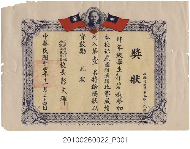 2010.026.0022 郭碧娥花蓮縣西富國民學校保護甘蔗演講比賽獎狀