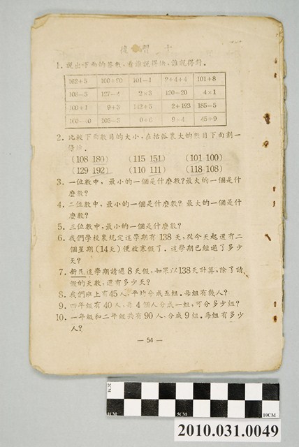 本件為國立編譯館主編《國民學校算術課本》,版權頁已遺失,版次為暫用本,冊次為初級第1冊。本書適用於國民學校第3學年第1學期算術課程,內容主要為三位數以下的加減法、基本乘除法、單位的認識,並附有13篇複習與4篇測驗。