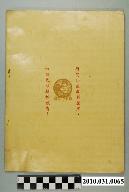 本文物為提供中等學校學生配合歷史科使用之地圖,並附有該書使用說明書,本書由楊德鈞主編,封面有于右任題名「中等學校學生必備歷史教科圖」,封底印刷「研究外國教科歷史」、「加強民族精神教育」等標語。
