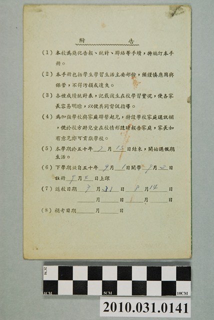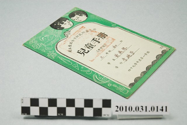 1.本文物為省立台北女子師範學校附屬小學中年級學生聯絡簿,為五十學年度三年和班學生黃燕琴所有(導師李迺芬);兒童手冊紀錄學生生活情形、成績統計以做為與家長聯絡之用。2.「臺灣總督府國語學校附屬小學校」創立於1913年,光復後改稱為「臺灣省立臺北女子師範學校附屬小學」,爾後經歷師範學校改制為師專、師院,校名皆有變更。師院改制為教育大學後,更名為「臺北市立教育大學附設實驗國民小學」,2013年再次更名為「臺北市立大學附設實驗國民小學」。