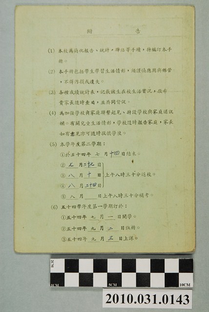 1.本文物為省立台北女子師範學校附屬小學中年級學生聯絡簿,為五十三學年度下學期四年禮班學生黃衍成所有(導師孫韶荏);兒童手冊紀錄學生生活情形、成績統計以做為與家長聯絡之用。2.「臺灣總督府國語學校附屬小學校」創立於1913年,光復後改稱為「臺灣省立臺北女子師範學校附屬小學」,爾後經歷師範學校改制為師專、師院,校名皆有變更。師院改制為教育大學後,更名為「臺北市立教育大學附設實驗國民小學」,2013年再次更名為「臺北市立大學附設實驗國民小學」。