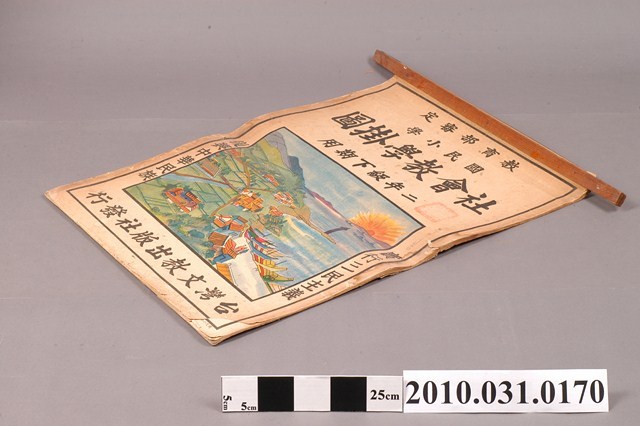 本件為《國民小學社會教學掛圖》,適用年級為二年級上學期,彩色印刷,發行時間不詳,由台灣文教出版社發行,圖上附木製掛軸。封面印有:「實行三民主義、復興中華民族」字樣,本件計有19圖,內容包括四單元:(一)我們的食物、(二)我們的衣服、(三)我們的房屋、(四)我們的交通。