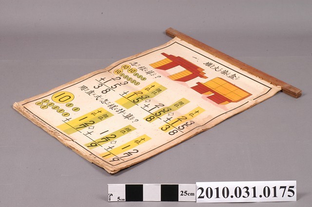 本件為《國民小學數學教學掛圖》,適用年級為二年級上學期,彩色印刷,由於封面佚失,故發行時間及發行者不詳,僅能推測為台灣文教出版社發行之掛圖,圖上附木製掛軸。本件包括8張圖,包括:填填看有多長?畫圖形、數數看、怎麼算、綜合與應用等課程。