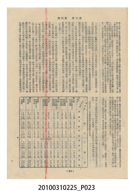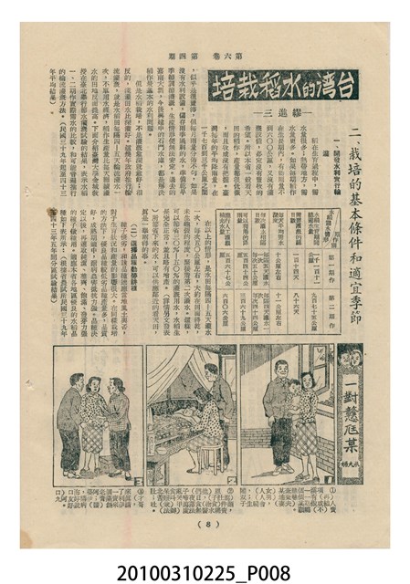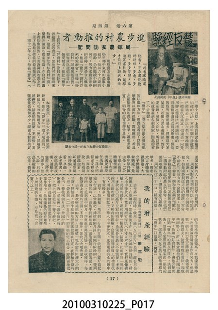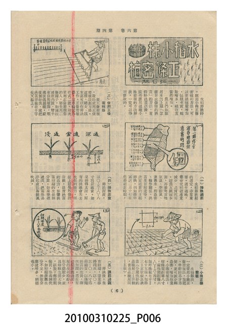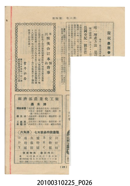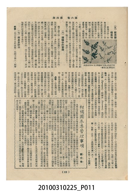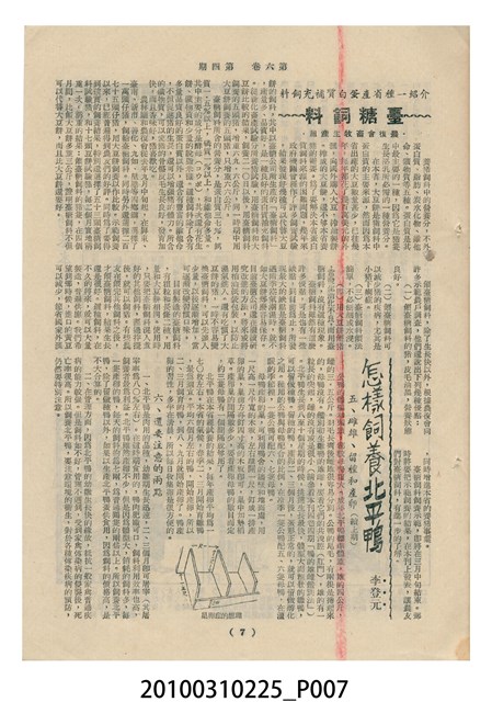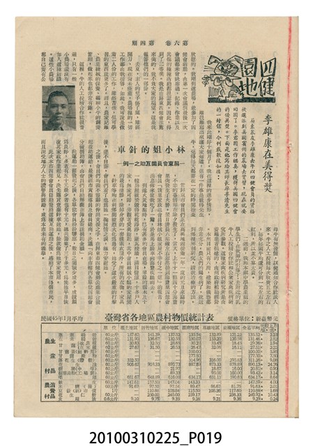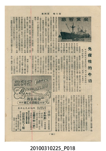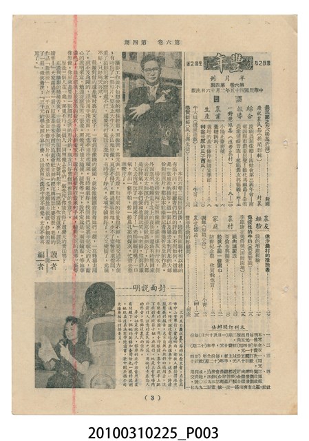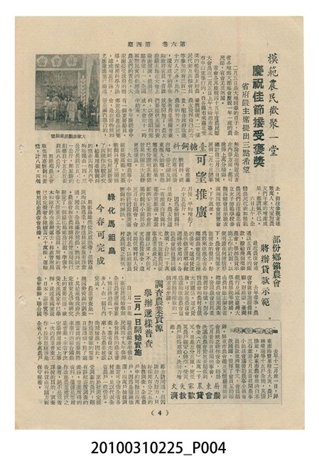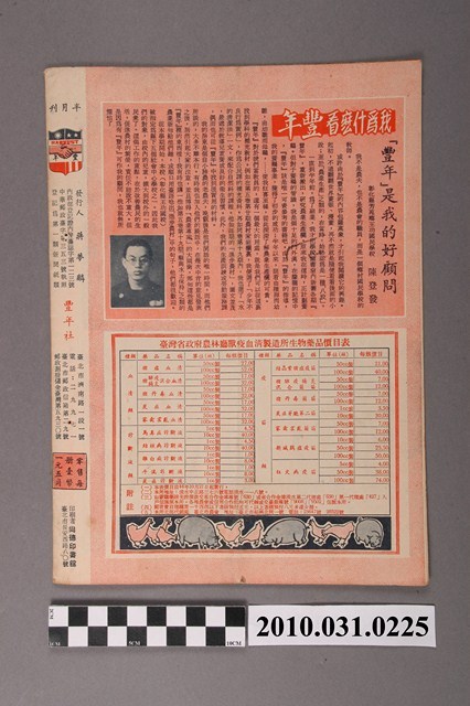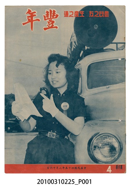 1.本物件為《豐年》雜誌第6卷第4期。封面、封底均用彩色印刷。封面以楊基炘所攝的「農民節之花」為底圖。左上部印期刊名緊接著由右至左印「農民之友 生產之道」字樣,右下部由右而左橫印「第六卷第4期」,正下緣由右而左橫印「中華民國四十五年二月十六日」。封底左半部載定價及登記、發行、印刷等相關資訊,左上角印有豐年社的商標。內文第3頁右邊為目錄。收錄文章主要為與農畜業相關報導,此外,尚有牛哥漫畫、農村家庭、小說等專欄。