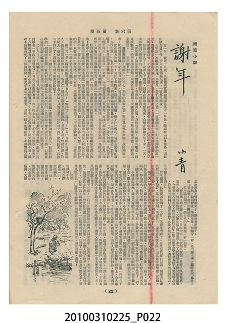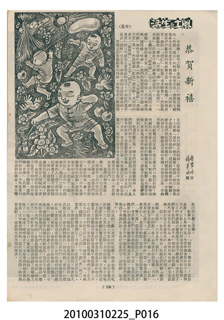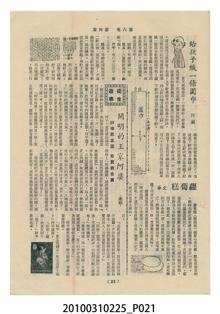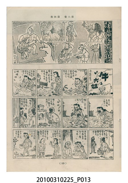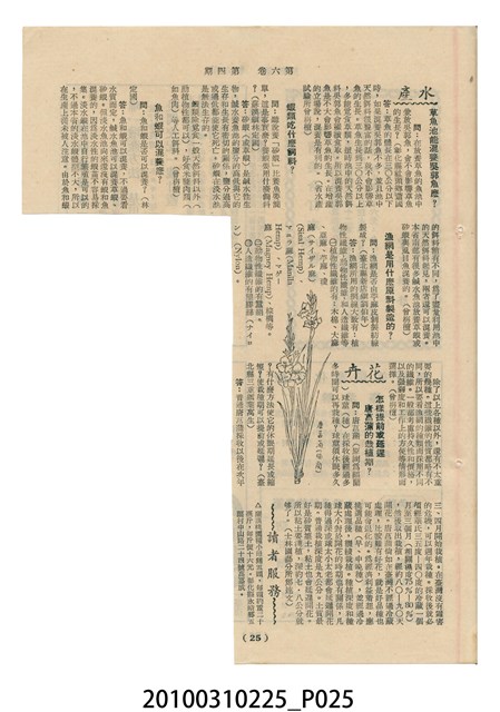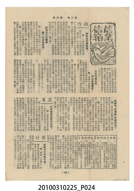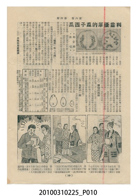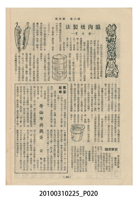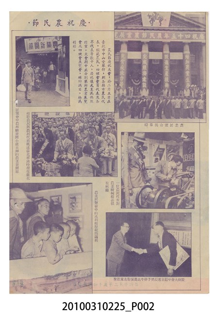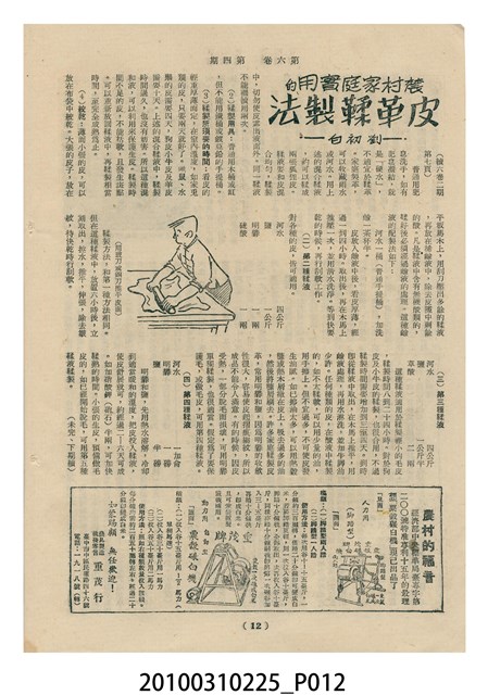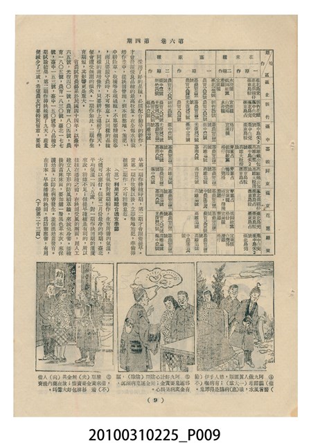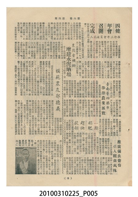 1.本物件為《豐年》雜誌第6卷第4期。封面、封底均用彩色印刷。封面以楊基炘所攝的「農民節之花」為底圖。左上部印期刊名緊接著由右至左印「農民之友 生產之道」字樣,右下部由右而左橫印「第六卷第4期」,正下緣由右而左橫印「中華民國四十五年二月十六日」。封底左半部載定價及登記、發行、印刷等相關資訊,左上角印有豐年社的商標。內文第3頁右邊為目錄。收錄文章主要為與農畜業相關報導,此外,尚有牛哥漫畫、農村家庭、小說等專欄。