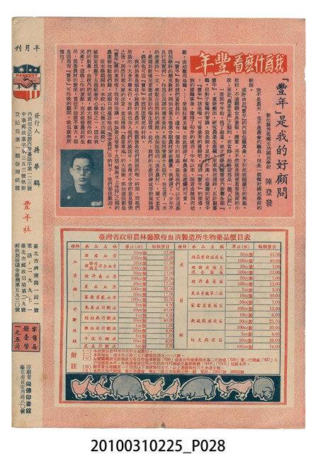 2.《豐年》雜誌是由豐年社所發行的刊物,豐年社成立於民國40年(1951),成立目的在發行銷售有關農業書刊、產品及資材,以服務農民、提高農家所得、改善農家生活。同年7月15日開始發行《豐年》半月刊,初期定位為專業性的農業雜誌,後為因應經濟結構及農村社會的改變,內容也隨之調整,收錄有關生活與生態問題之文章。民國106年(2017)9月,雜誌改為月刊,至今。