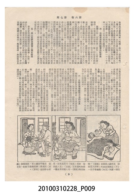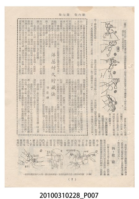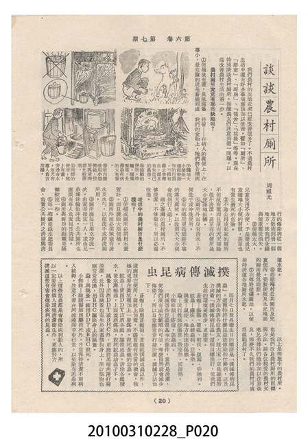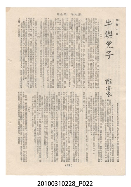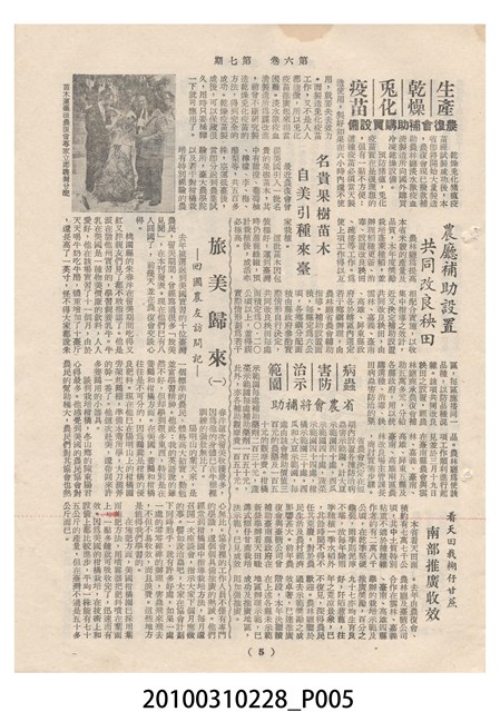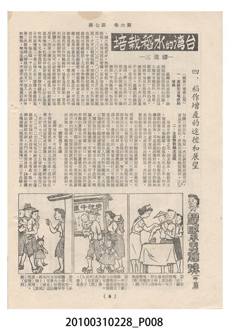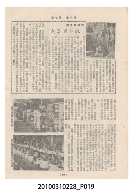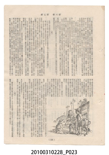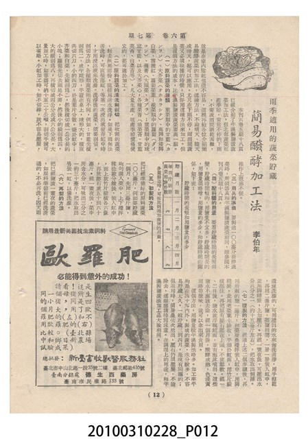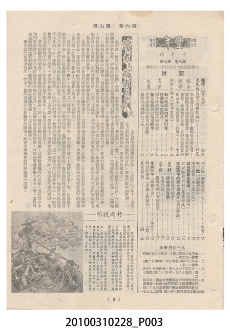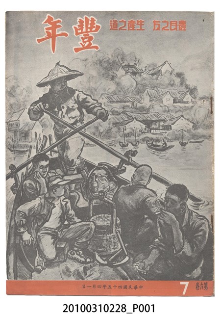 1.本物件為《豐年》雜誌第6卷第7期。封面、封底均用彩色印刷。封面以楊英風所作的「關渡」為底圖。左上部印期刊名,接著由右至左印「農民之友 生產之道」字樣,右下部由右而左橫印「第六卷第7期」,正下緣由右而左橫印「中華民國四十五年四月一日」。封底左半部載定價及登記、發行、印刷等相關資訊,左上角印有豐年社的商標。內文第3頁右邊為目錄。收錄文章主要為與農畜業相關報導,此外,尚有牛哥漫畫、農村家庭、小說等專欄。