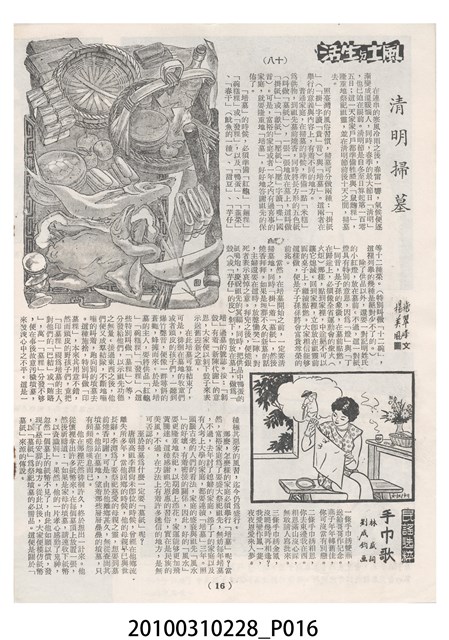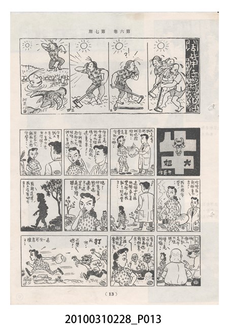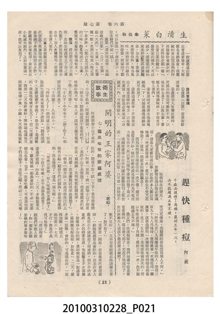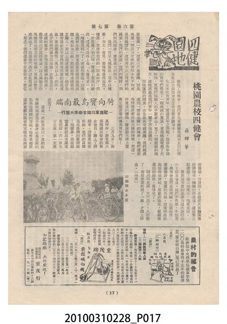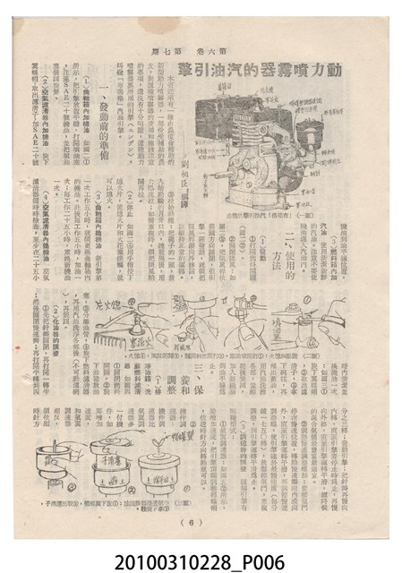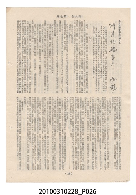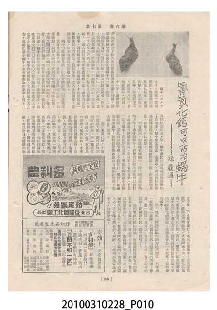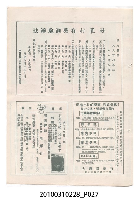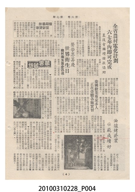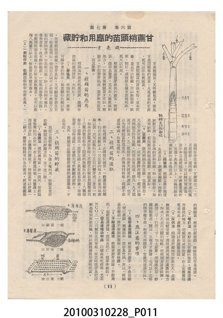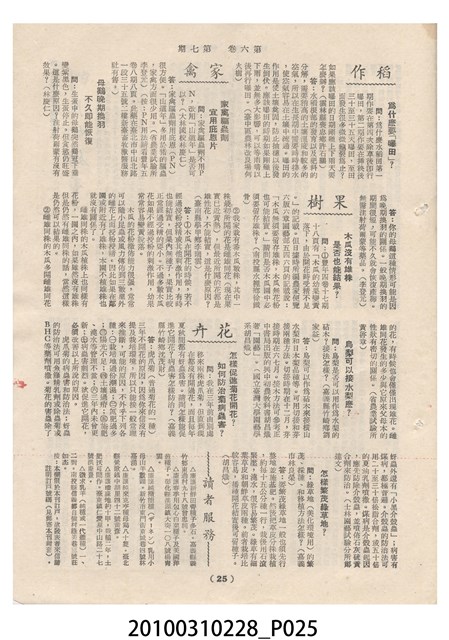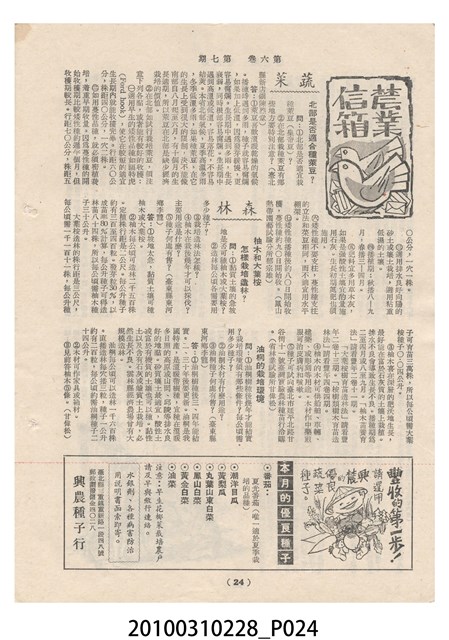 1.本物件為《豐年》雜誌第6卷第7期。封面、封底均用彩色印刷。封面以楊英風所作的「關渡」為底圖。左上部印期刊名,接著由右至左印「農民之友 生產之道」字樣,右下部由右而左橫印「第六卷第7期」,正下緣由右而左橫印「中華民國四十五年四月一日」。封底左半部載定價及登記、發行、印刷等相關資訊,左上角印有豐年社的商標。內文第3頁右邊為目錄。收錄文章主要為與農畜業相關報導,此外,尚有牛哥漫畫、農村家庭、小說等專欄。