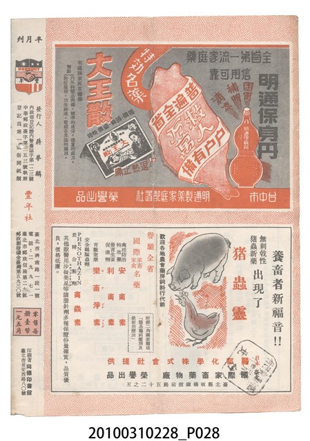 2.《豐年》雜誌是由豐年社所發行的刊物,豐年社成立於民國40年(1951),成立目的在發行銷售有關農業書刊、產品及資材,以服務農民、提高農家所得、改善農家生活。同年7月15日開始發行《豐年》半月刊,初期定位為專業性的農業雜誌,後為因應經濟結構及農村社會的改變,內容也隨之調整,收錄有關生活與生態問題之文章。民國106年(2017)9月,雜誌改為月刊,至今。