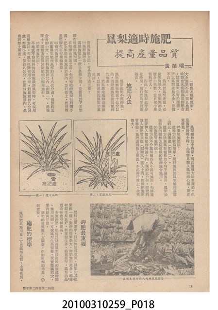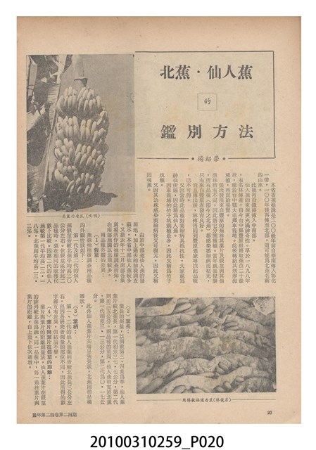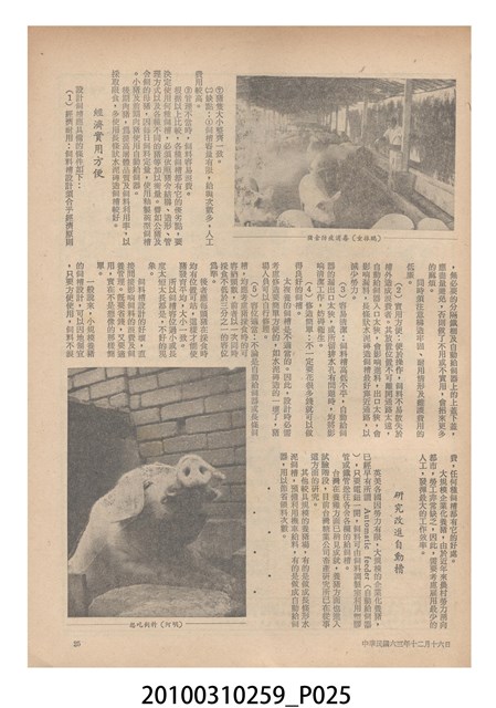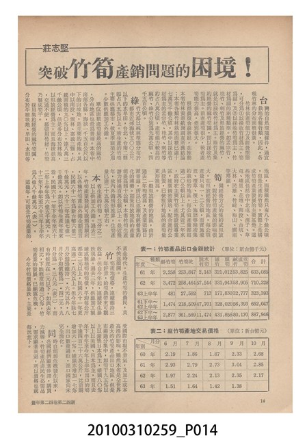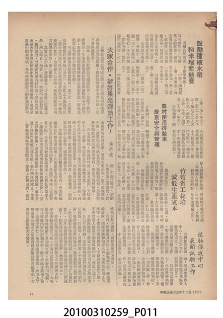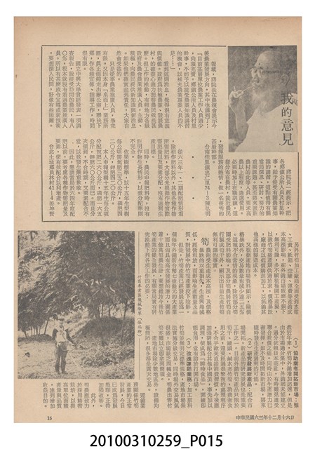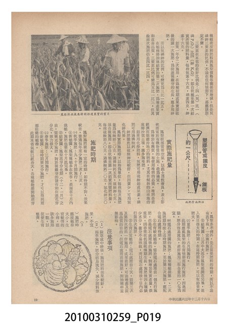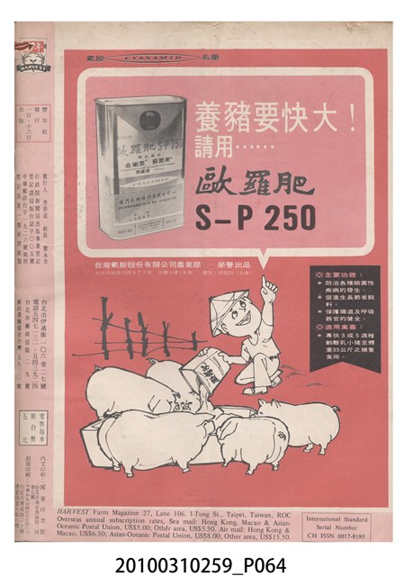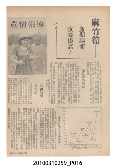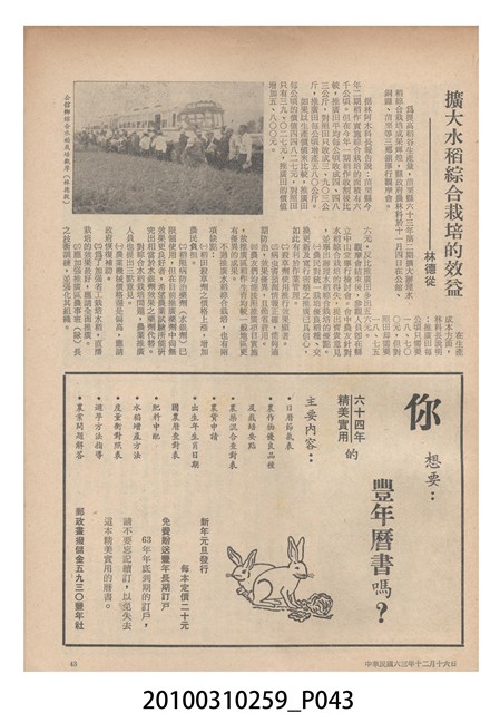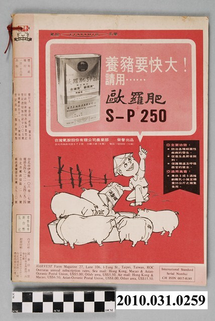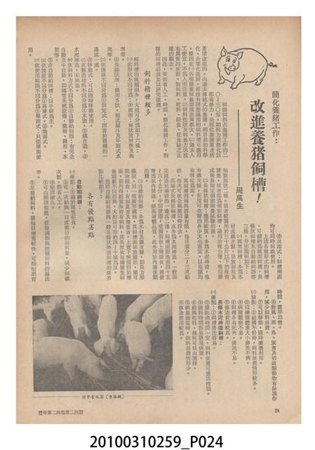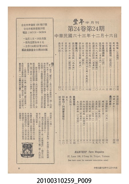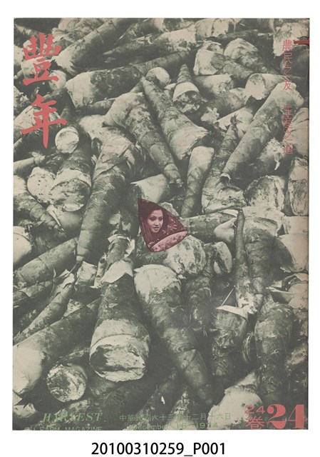 1.本物件為《豐年》雜誌第24卷第24期。封面、封底均用彩色印刷。封面以朱義朝所攝的「毛竹筍」為底圖。左上部直印期刊名,左下角則印英文刊名。右上角由上而下印「農民之友 生產之道」字樣,右下部由左而右橫印「第24卷第24期」,正下緣由左而右橫印「中華民國六十三年十二月十六日」。封底左半部載定價及登記、發行、印刷等相關資訊,左上角印有豐年社的商標。內文第9頁右半邊為目錄。收錄文章主要為與農畜業相關報導,此外,尚有豐年畫刊、農村家庭、農業信箱等專欄。