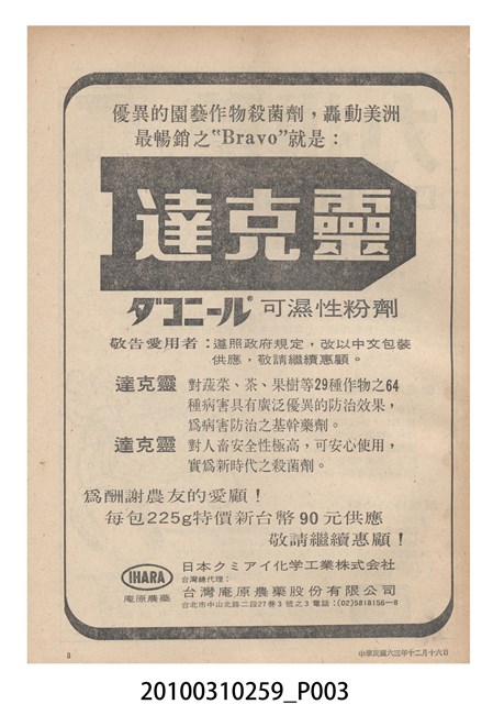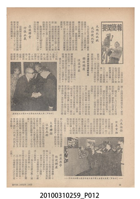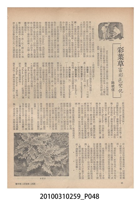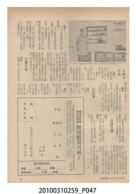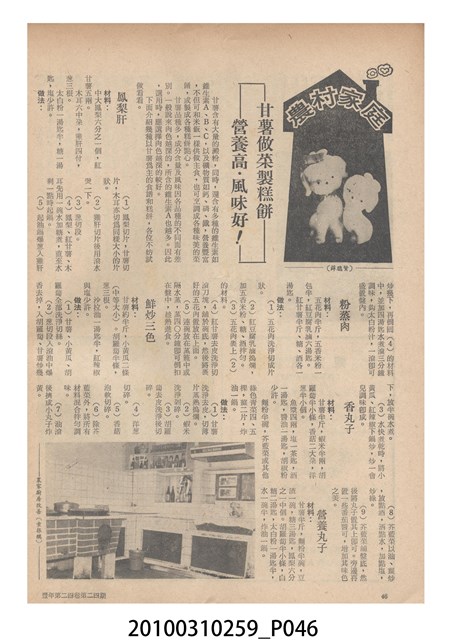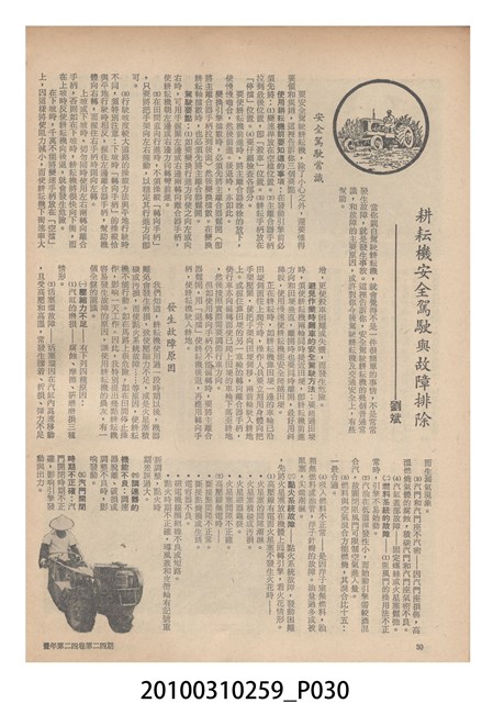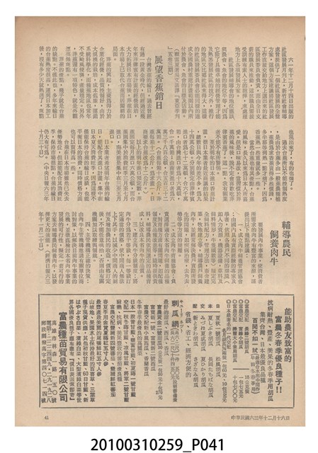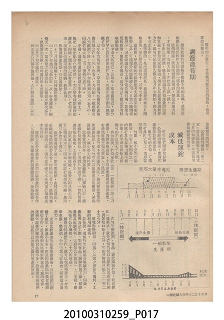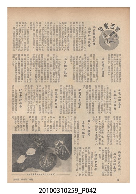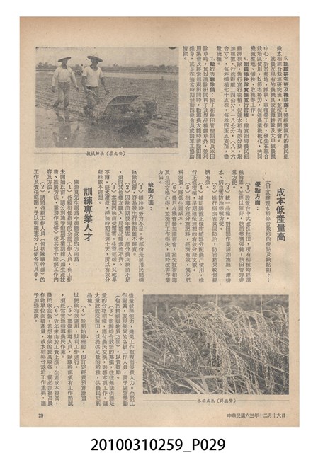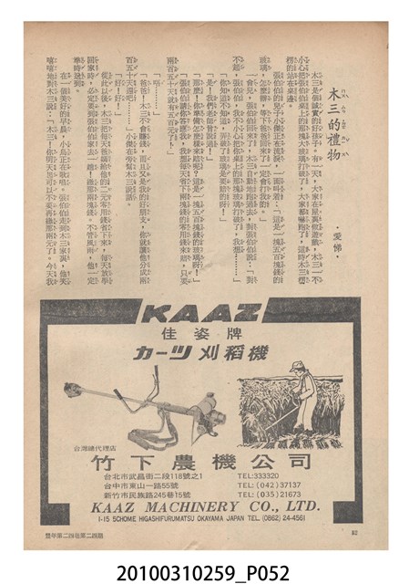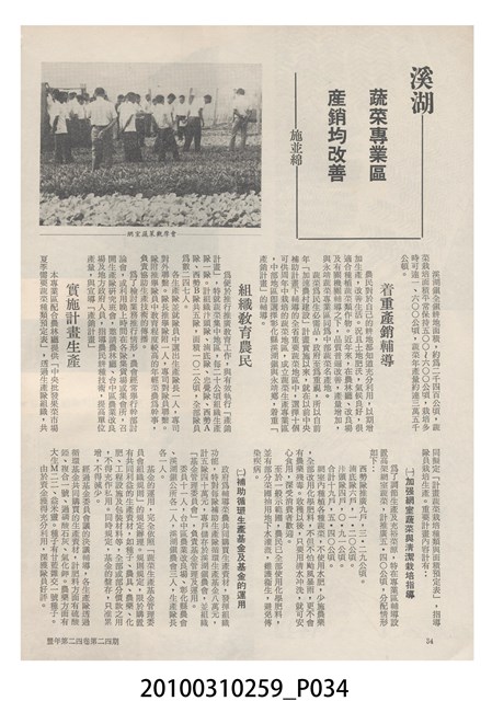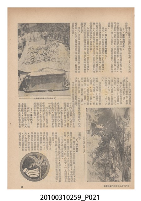 1.本物件為《豐年》雜誌第24卷第24期。封面、封底均用彩色印刷。封面以朱義朝所攝的「毛竹筍」為底圖。左上部直印期刊名,左下角則印英文刊名。右上角由上而下印「農民之友 生產之道」字樣,右下部由左而右橫印「第24卷第24期」,正下緣由左而右橫印「中華民國六十三年十二月十六日」。封底左半部載定價及登記、發行、印刷等相關資訊,左上角印有豐年社的商標。內文第9頁右半邊為目錄。收錄文章主要為與農畜業相關報導,此外,尚有豐年畫刊、農村家庭、農業信箱等專欄。