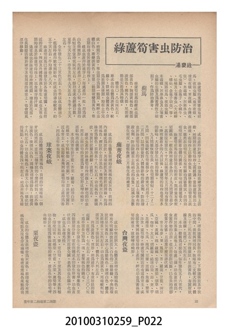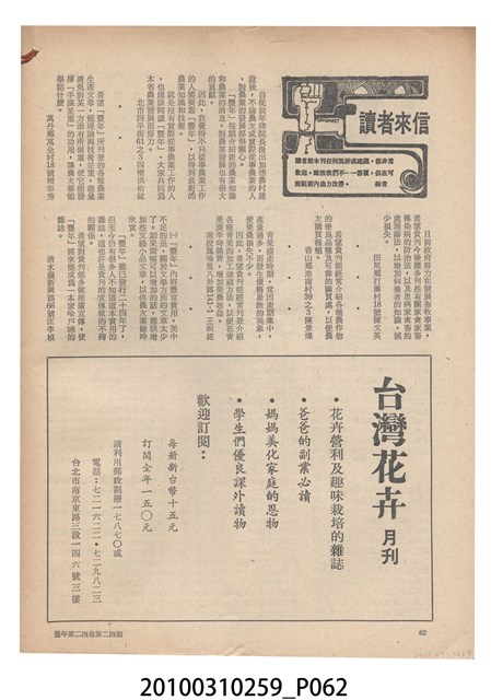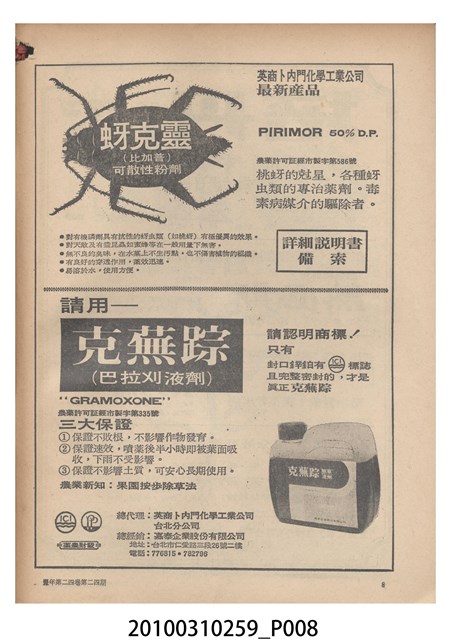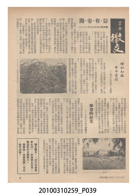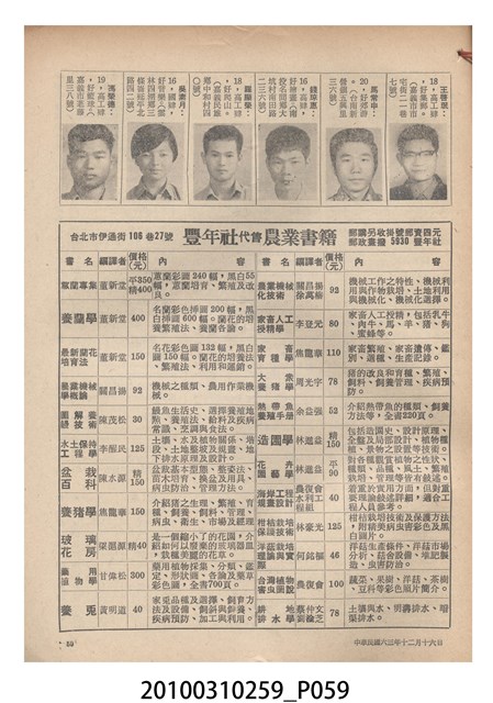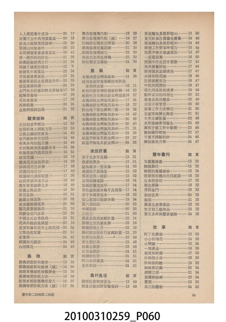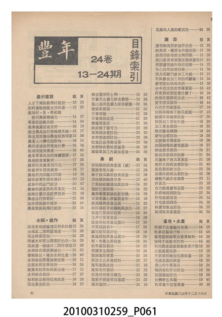 2.《豐年》雜誌是由豐年社所發行的刊物,豐年社成立於民國40年(1951),成立目的在發行銷售有關農業書刊、產品及資材,以服務農民、提高農家所得、改善農家生活。同年7月15日開始發行《豐年》半月刊,初期定位為專業性的農業雜誌,後為因應經濟結構及農村社會的改變,內容也隨之調整,收錄有關生活與生態問題之文章。民國106年(2017)9月,雜誌改為月刊,至今。