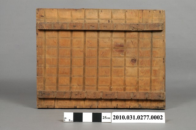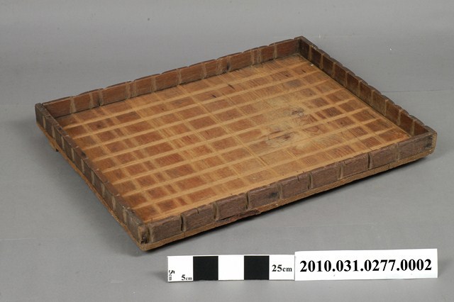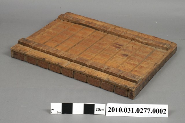 本件為爆米香機具組配件之一爆米香切盤,以木頭製成,長約74.6公分,寬約57.6公分,高約8.2公分,由一片底板與四面淺木板組成,整體如淺托盤造形。底板與四邊均有度量用刻痕,小販在製作爆米香時,會將爆好的米與麥芽糖、配料等混合,接著倒入切盤,用擀麵棍將之壓平,再依切盤上的刻度,將爆米香切成預計需求的大小。