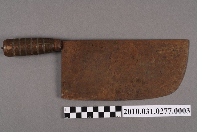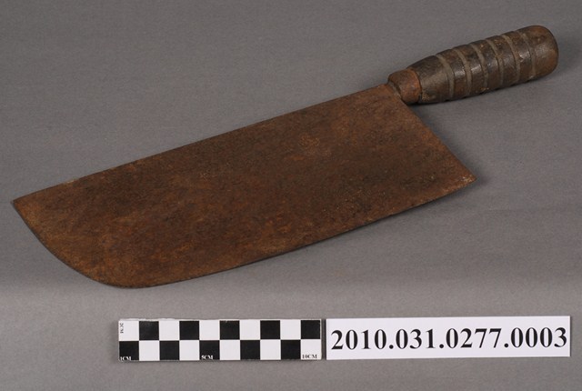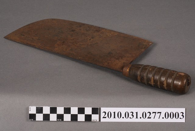 本件為爆米香機具組配件之一米香刀,以金屬與木頭製成,長約32.8公分,寬約11.2公分,高約3.3公分,由木製刀柄與金屬製刀組成。米香刀的刀部份約為長方形,多由鋼或不銹鋼製成,刀刃部份則外層包鐵作為強化。刀鑲嵌於木頭握柄上,握柄做有六圈壓紋。此菜刀握柄多處有明顯磨損,刀面亦有鏽蝕情形,整體呈棕紅色。米香刀是爆米香小販用來裁切製作好的爆米香時使用。