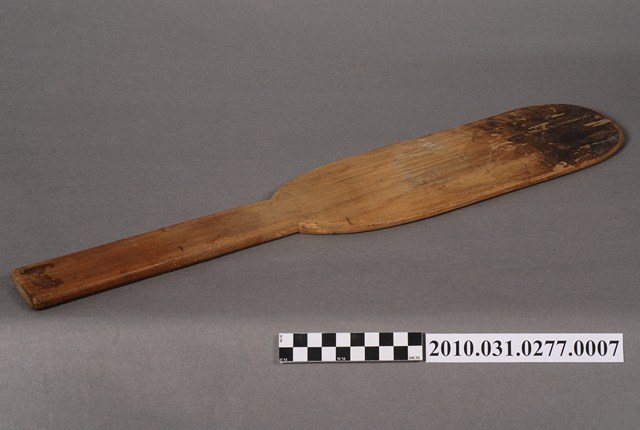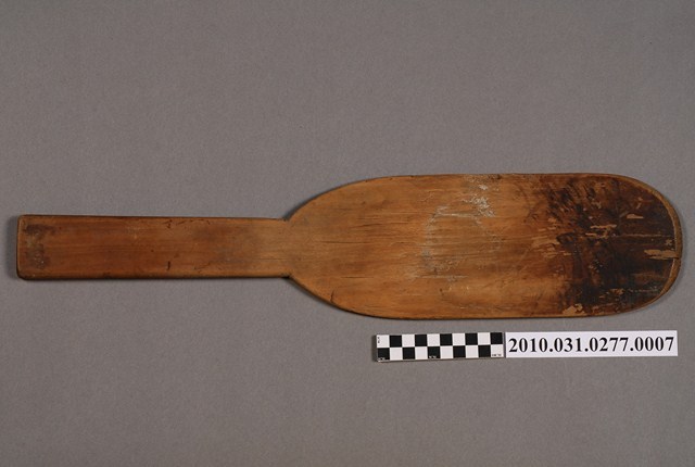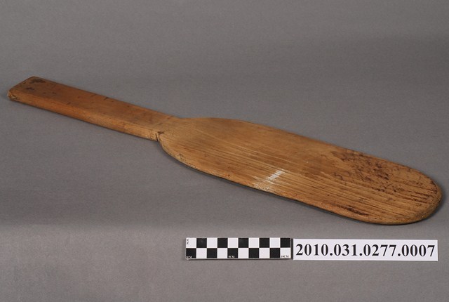 本件為爆米香機具組配件之一攪拌棒,以木頭製成,長約52.5公分,寬約11.4公分,高約1.6公分。攪拌棒為扁平木板狀,至握柄部份內縮,厚度由攪拌部份至握柄部份漸增。爆米香小販在製作爆米香時,會用此攪拌棒將爆好的米、糖漿與配料拌炒,混合均勻後放涼。