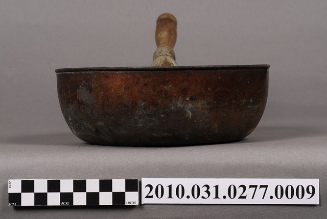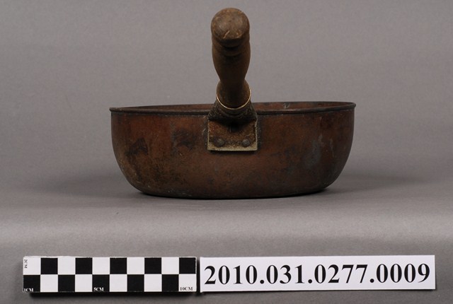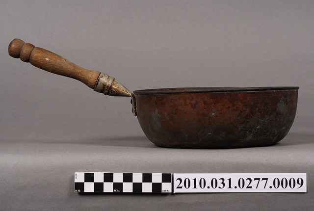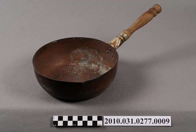 本件為爆米香機具組配件之一麥芽加熱鍋,木製鍋柄與金屬製鍋體,長約32.2公分,寬約17.9公分,高約12.2公分。鍋子邊緣反折為滾邊,鍋壁垂直至底座微微內縮,平底。一側用三個釘子固定鍋柄,與鍋子連接處為金屬製,至中段內嵌木製握把,握把做腰身曲線,至頂端有兩圈壓紋。整體有明顯鏽蝕情形。此鍋為爆米香小販用來加熱麥芽糖漿用。