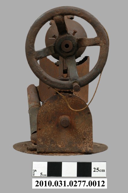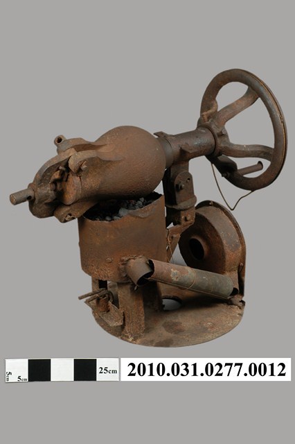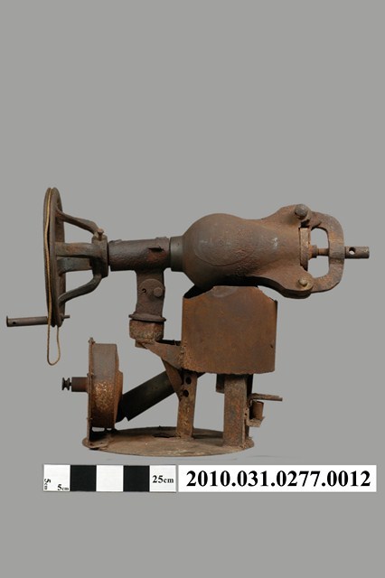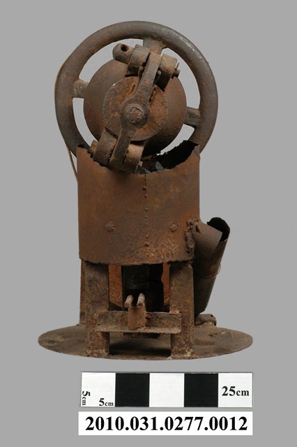 本件為爆米香機具組配件之一爆米香炭火爐,以鐵製成,長約65.9公分,寬約36.8公分,高約54.4公分,包含容器與加熱部份。炭火爐的容器部份位在上半部,呈滾筒狀,一側連接轉盤,轉盤上有把手,使用者須不斷轉動轉盤,使容器內的米能夠均勻受熱。下半部為炭火爐的部分,內有些許木炭,用以加熱容器內的米。整體有圓盤狀底座,並有明顯鏽蝕情形。