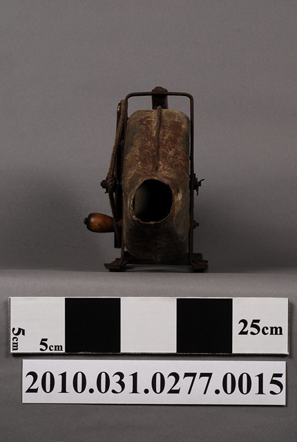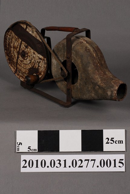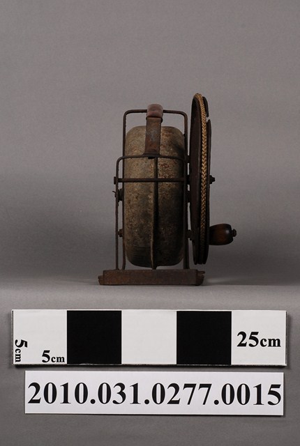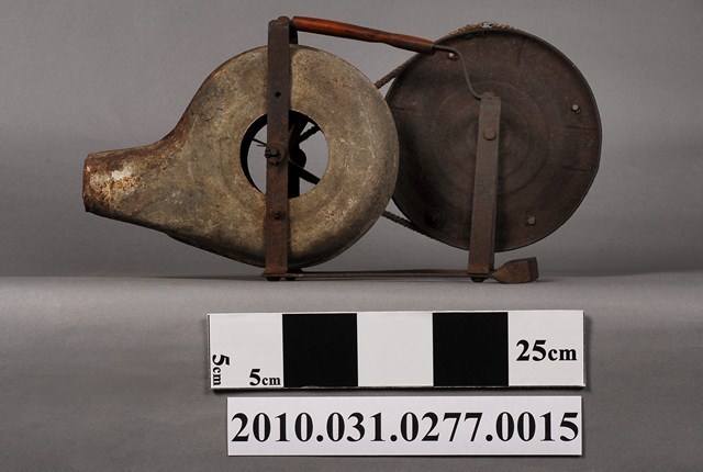本件為爆米香機具組配件之一手搖式鼓風機,此件鼓風機由鐵與皮製成,長約36.4公分,寬約13.2公分,高約18.8公分。鼓風機包括鼓風管與手搖轉盤,兩者固定於鐵製支架上,兩者之間以皮帶組連接。鼓風管含扇葉軸,使用者可利用手搖轉盤的轉速來控制鼓風管的出風大小,大大幫助的古早人們使用火爐時的作業,是很普遍的民生用品之一。此鼓風機為爆米香小販用來調控炭火爐火力大小用。