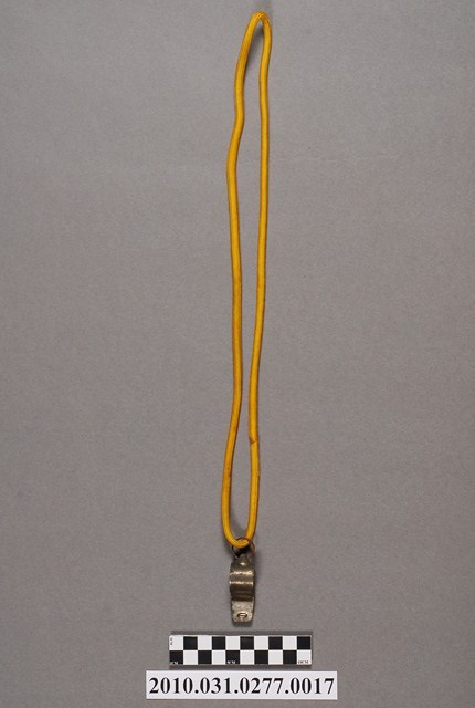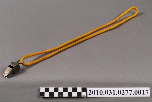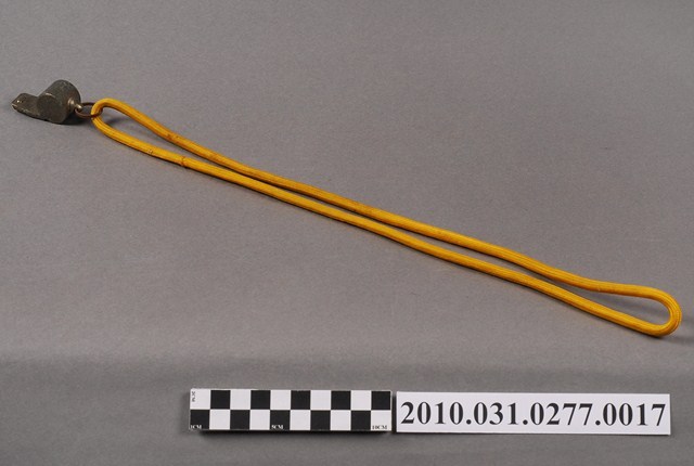 本件為爆米香機具組配件之一哨子,以金屬與塑膠製成,長約44.2公分,寬約1.7公分,高約2.1公分,由掛繩與哨子本體組成。掛繩部分為黃色尼龍繩,整體有多處髒汙。哨子本體由金屬製成,由一扣環連接掛繩部分,有些許鏽蝕痕跡。爆米花攤販將生米放入炭火爐加熱,爐內的壓力達到一定程度後,便準備打開爐蓋,此時壓力瞬間釋放將產生巨大聲響,而哨子便是攤販開爐前,用以提醒附近民眾即將開爐的工具,民眾聽到哨音,即代表香噴噴的爆米香準備出爐了。