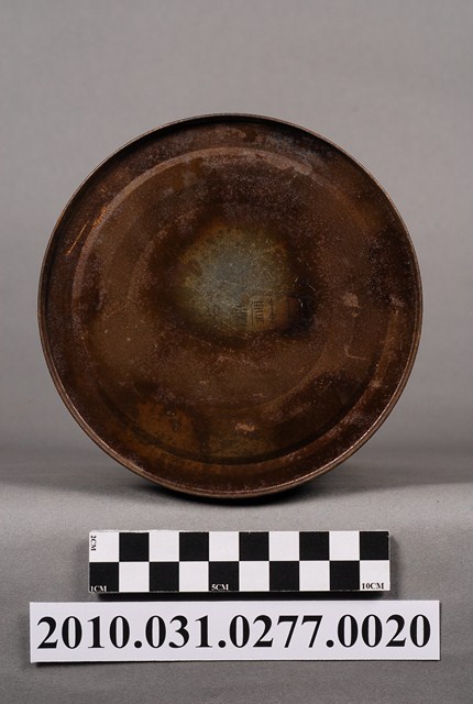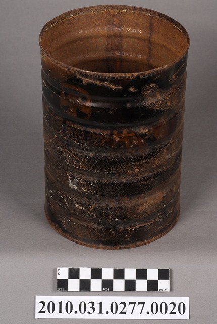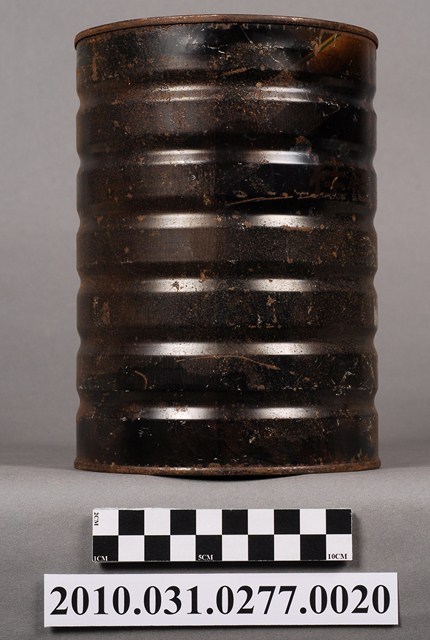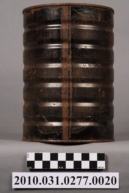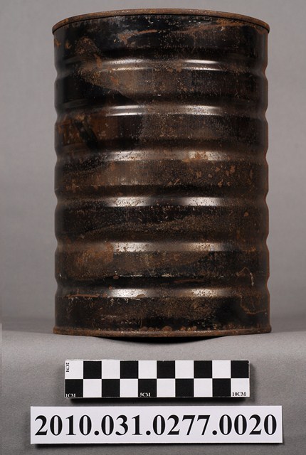 本件為爆米香機具組配件之一盛米罐,罐身以金屬製成,長約12.8公分,寬約12.8公分,高約18.2公分。盛米罐為圓桶型,罐口有反摺滾邊,罐身做六圈壓紋,罐底有一同心圓壓紋,邊緣亦有滾邊。整體為黑色,有明顯鏽蝕痕跡。此罐為爆米香攤販用以盛裝生米所使用。