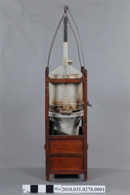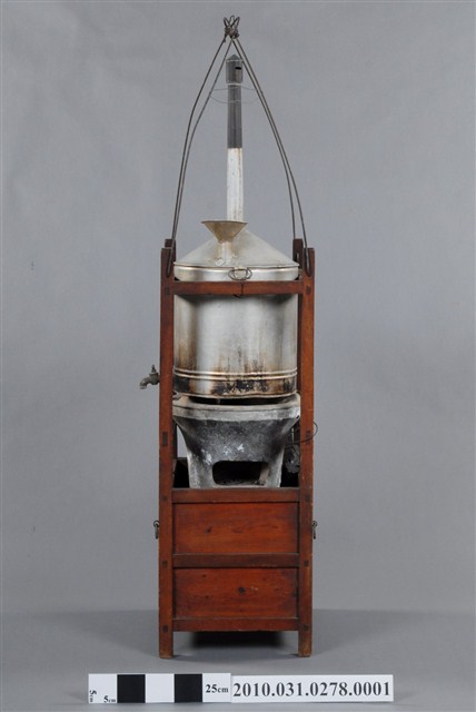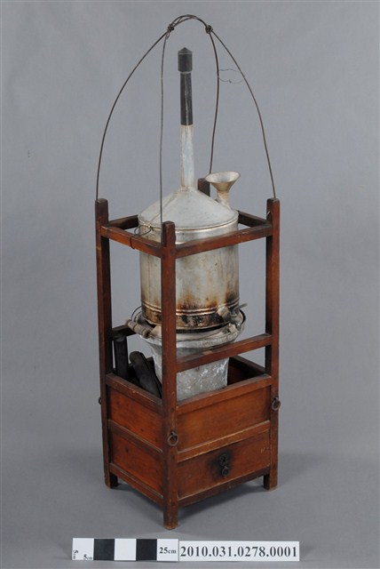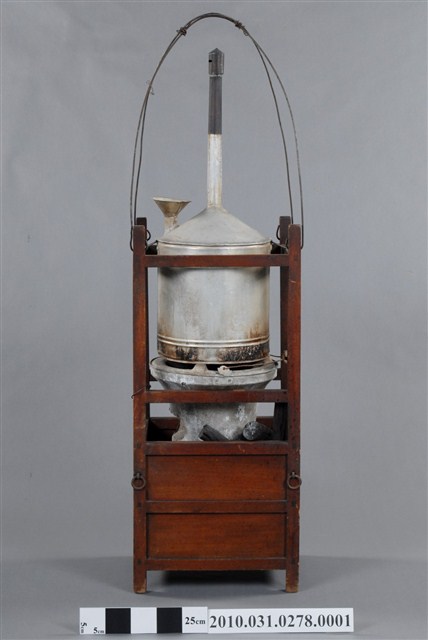 本件為麵茶攤組配件之一麵茶攤木櫃,櫃內設有燒水桶與鍋爐,木櫃最上層四角以粗鐵絲穿孔向上做圓弧形,上緣相綑,作為扁擔支撐點。木櫃上半部鏤空,內崁鍋爐與燒水桶,燒水桶前方有水龍頭出水口,桶頂側邊有倒錐形蒸氣孔,桶頂正上方則突起長管為氣笛,當桶內水燒開時會發出響亮笛音,吸引周圍民眾前來消費。木櫃下層有一抽屜,作為抽納空間,並裝有金屬扣環握把。櫃體前後各有兩金屬環,應是用來提拿或固定用。
