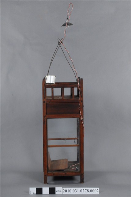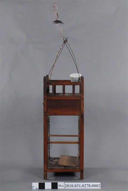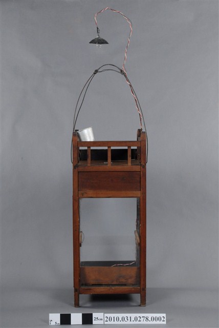 本件為麵茶攤組配件之一麵茶攤木櫃,長約36.6公分,寬約34公分,高約149.3公分,分為三層,最上層為一平台,三邊做柵欄,一邊為檔,其一角掛著金屬圓杯。四角以粗鐵絲穿孔向上做圓弧形,上緣相綑,作為扁擔支撐點,往上再延伸一彎曲鐵絲,吊掛一盞燈,燈的供電電線為紅白相間,並沿著鐵絲纏繞至最下層。木櫃中層為一抽屜,抽屜裝有金屬把手。下層為一較高的收納空間,櫃體三面由玻璃組成,一面鏤空但裝有矮檔,此層內放有一L型木板,應是作為收納用。