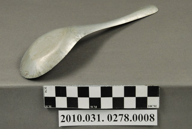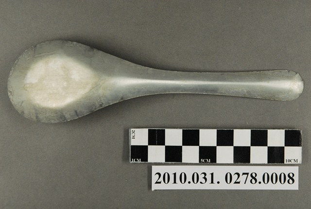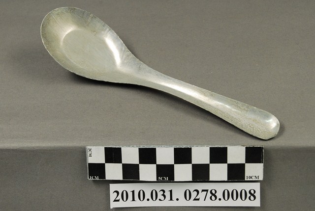 本件為麵茶攤組配件之一吃麵茶用的金屬湯匙,長約17公分,寬約4.6公分,高約3.5公分,整體表面有氧化痕跡。湯匙為中餐式湯匙,柄與匙一體成形製成,匙的部分為平底,匙壁深廣。整體並無任何裝飾與紋樣,邊緣有些微壓痕,應是於生產過程中產生。此湯匙為麵茶攤提供予消費者飲食用。